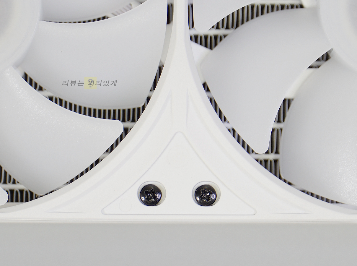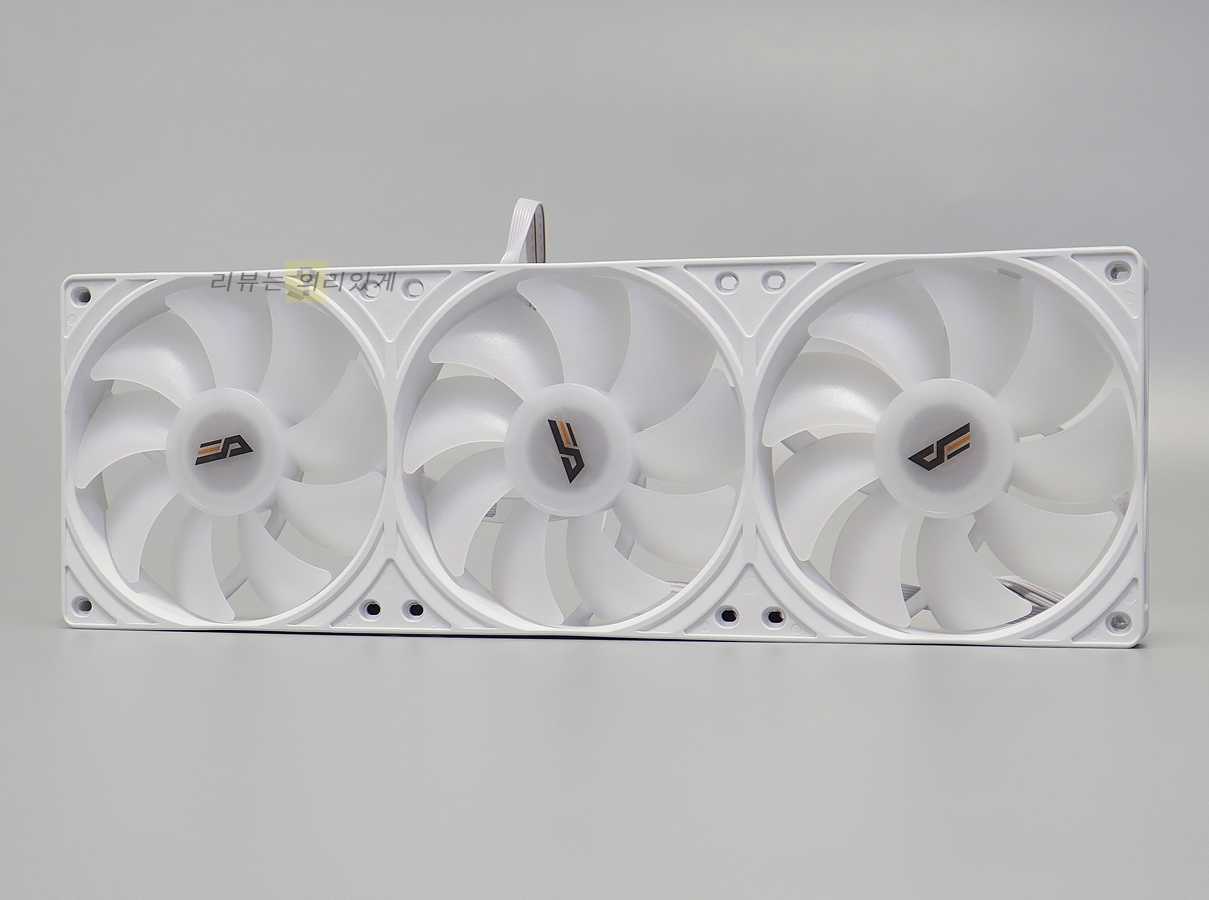 120mm 팬 3개를 사용하는 방식으로 360mm 라디에이터를 사용하는 3열 수랭 쿨러 방식입니다. 조립 편의성을 고려하여 팬과 라디에이터가 결합된 상태로 제공되며 펌프 유닛 상단과 같이 일부를 제외하면 모두 동일한 색상을 사용하였습니다. 제품은 블랙, 화이트 두 가지 색상으로 출시되었으며 리뷰에 사용된 제품은 화이트 색상입니다.