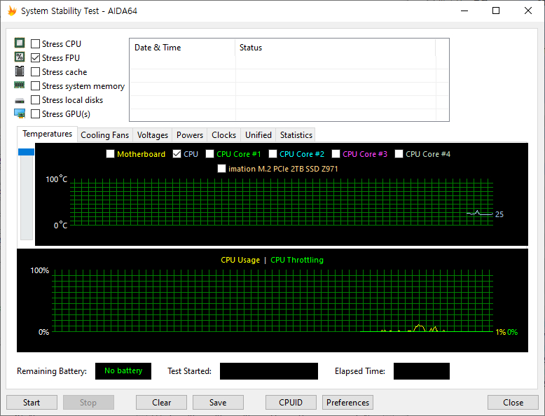 온도 측정 및 팬 RPM 측정은 AIDA64의 Stress FPU 항목을 선택하여 약 10분간 진행하였습니다. 테스트 진행 중 유휴 및 풀 로드 상태 확인은 HWiNFO를 사용하였습니다.