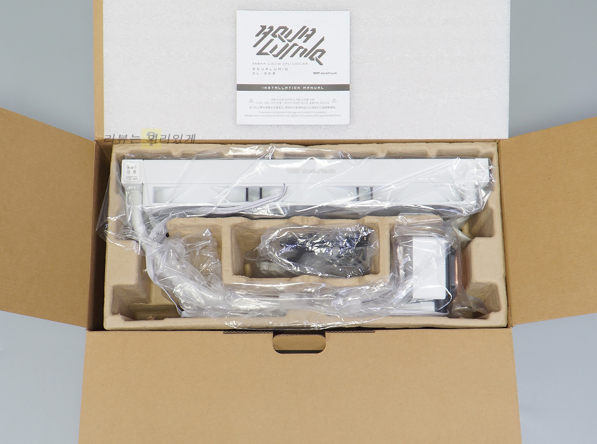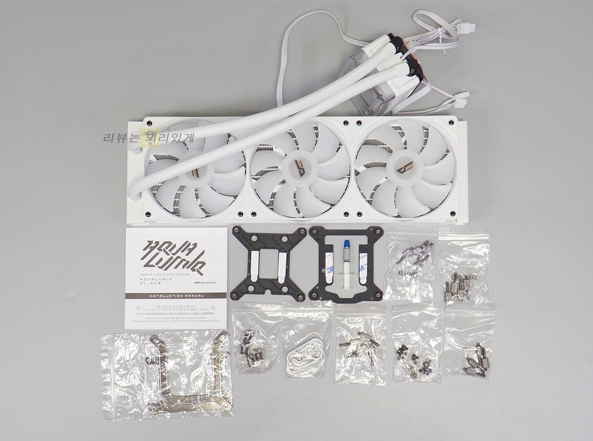 수랭 쿨러, 설명서, 인텔 백플레이트 2종, 인텔/AMD 브래킷, 인텔 조립 나사, AMD 조립 나사, 서멀 컴파운드, 튜브 클립, 라디에이터 조립 나사가 구성품으로 제공됩니다.