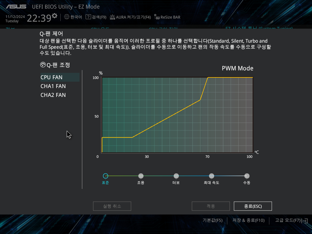 팬 제어 모드: 에이수스 바이오스의 Q-팬 제어에서 '표준'모드로 설정