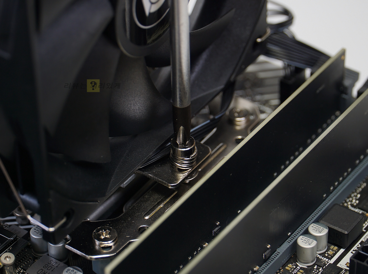 스프링 볼트 방식을 사용하고 있어 양쪽만 조립하면 되며 팬과 볼트와의 간섭이 없어 팬을 분리할 필요가 없습니다. 또한 히트파이프가 뒤로 밀려난듯한 디자인이 적용되어 RAM 슬롯과 멀리 떨어지게 되었습니다. 덕분에 간섭 문제는 걱정할 필요가 없습니다.