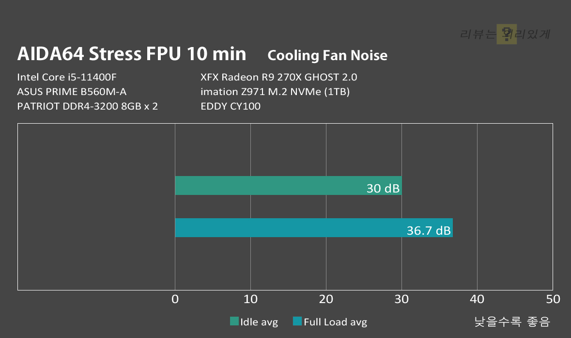 유휴에서는 30 데시벨, 풀로드에서는 36.7 데시벨로 확인되었습니다. 유휴에서 최저치 보다 약간 높게 작동하고 있었다는 것을 감안해도 조용한 편이었으며 풀로드에서는 당연하게도 팬 소리가 들리기 시작하지만 그렇다고 해서 너무 시끄러워 사용이 어려울 정도는 아니었습니다.