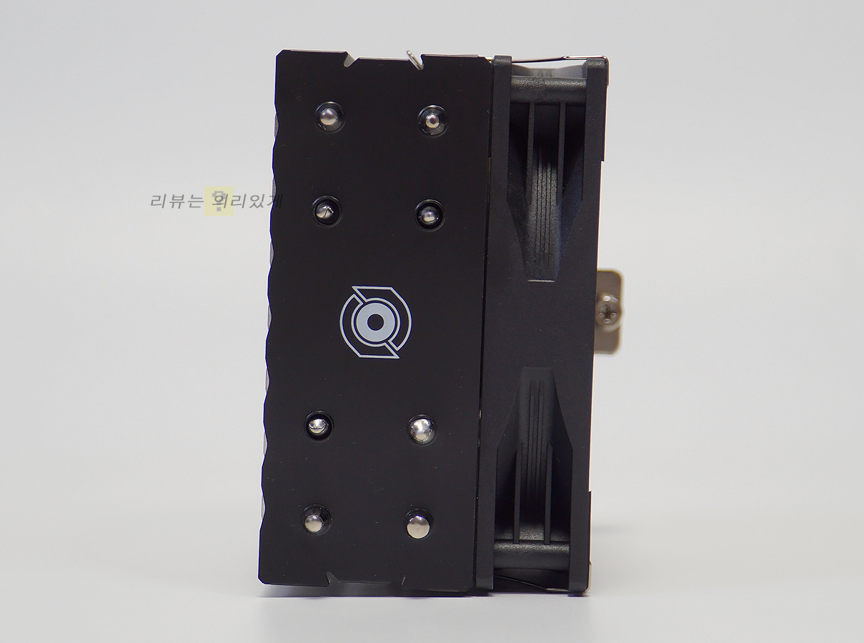 상단에는 커버가 없는 이전 방식으로 마감하여 히트파이프가 노출되어 있습니다. 대신 제품 색상과 동일한 색상을 도색하였으며 가운데 로고를 추가하였습니다. 히트싱크는 물결무늬 같은 특유의 패턴 무늬가 적용되어 있습니다.