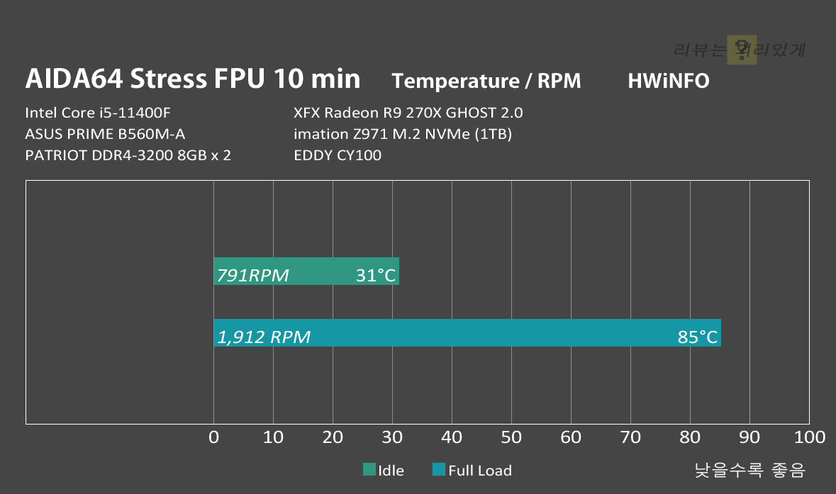다만 리뷰에서 사용한 AIDA64 Stress FPU는 CPU에 높은 부하를 주어 온도를 확인하는 방법 중 하나로서 일반적인 사용 용도에서는 이보다 온도가 높게 나올 것이라 생각하지 않습니다. 특히 CPU 쿨러는 케이스 크기, 내부 팬 크기 및 개수 등 쿨링 시스템과 실내 온도와 같이 주변 환경에 따라 변수가 달라질 가능성이 높기 때문에 모든 상황에서 이와 같다고 볼 수 없습니다.