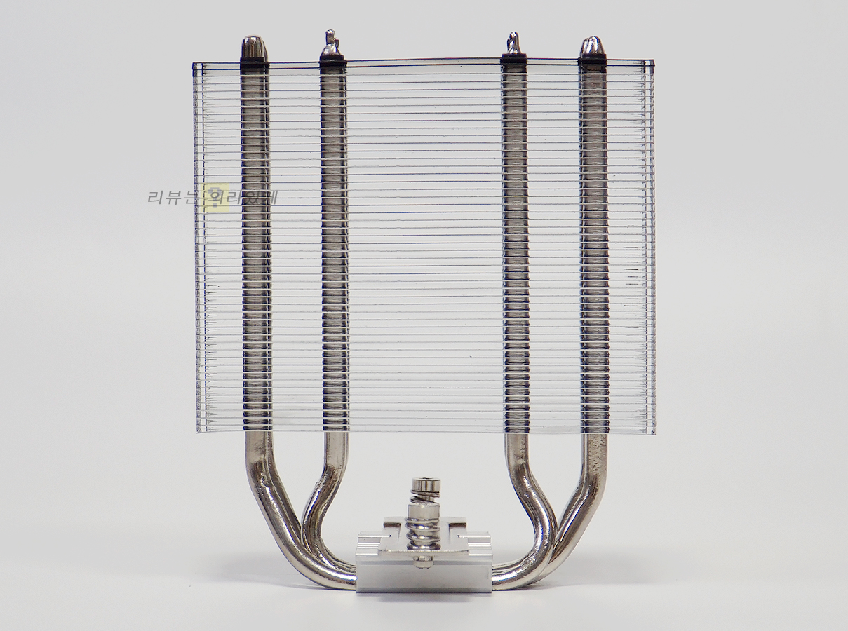 베이스는 CPU 스프레더와 히트파이프가 직접 맞닿는 HDT(Heatpipe Direct Touch) 방식을 채택하였습니다. 각 히트파이프에는 일정 간격을 두고 배치되었으며 2개씩 위치를 달리하였습니다. 베이스에는 보호 필름이 부착되어 있으므로 조립 전 이를 제거해야 합니다.