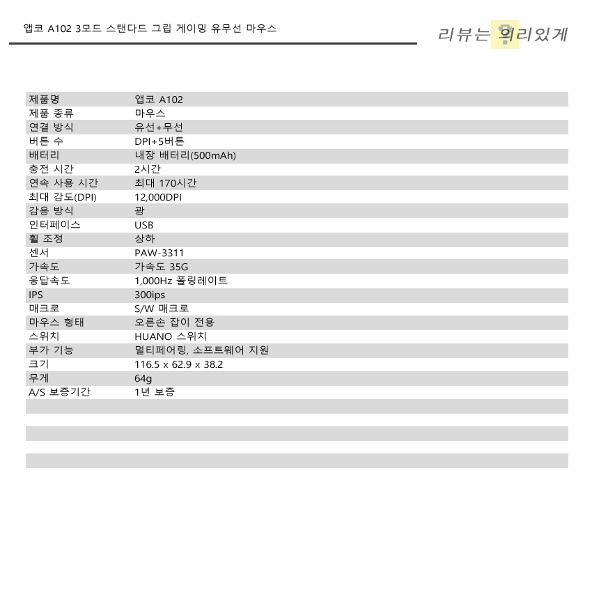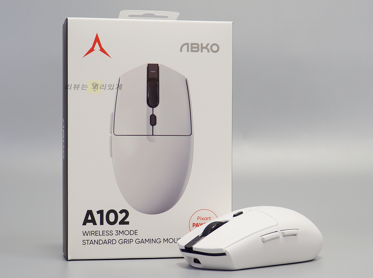 앱코 A102의 무게는 약 64g으로 경량화를 위해 과할 정도로 타공 구조를 만든 제품에 비하면 약간 무거운 편입니다. 하지만 그러한 구조의 경우 외부 충격이나 이물질 유입에 취약하기 때문에 무조건 좋다고 볼 수는 없습니다. 그럼에도 마우스 무게는 현재 기준으로 가벼운 편에 속합니다.