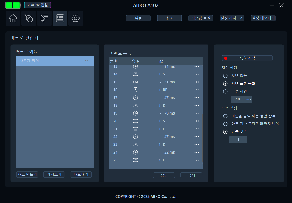 매크로 기능도 지원하고 있는데 사용자가 원하는 방식을 설정하고 이를 저장하고 버튼 기능 설정에서 사용하거나 할 수 있습니다.