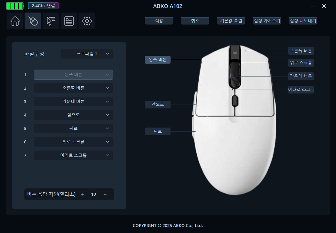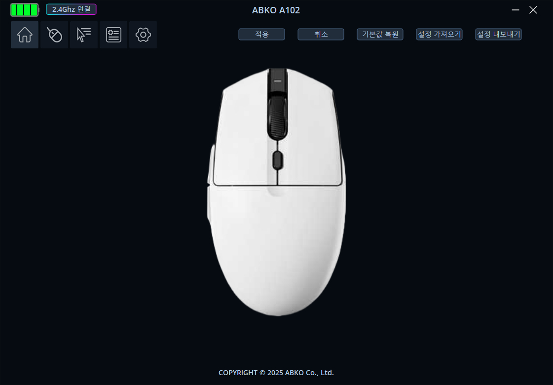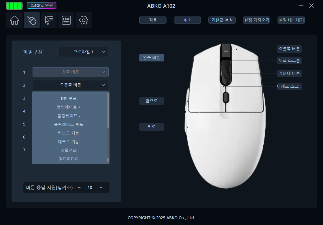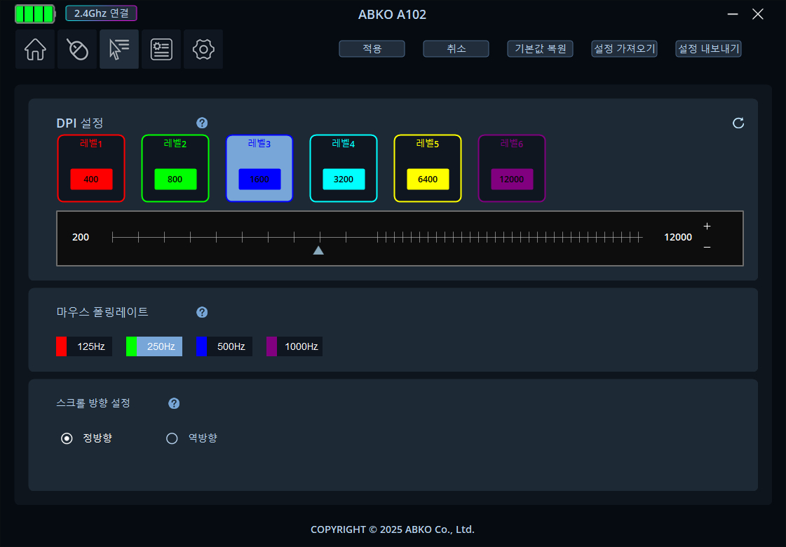 앱코 A102는 유선 외에도 블루투스, 2.4GHz 무선까지 총 3가지 연결 방식과 멀티 페어링을 지원하는 보급형 게이밍 마우스입니다. 이와 함께 소프트웨어도 지원하고 있어 폴링레이트, DPI 설정 등 다양한 기능을 변경할 수 있으며 조명 효과가 생략되었으나 필수 기능은 아니기에 단점으로 생각하지 않습니다.