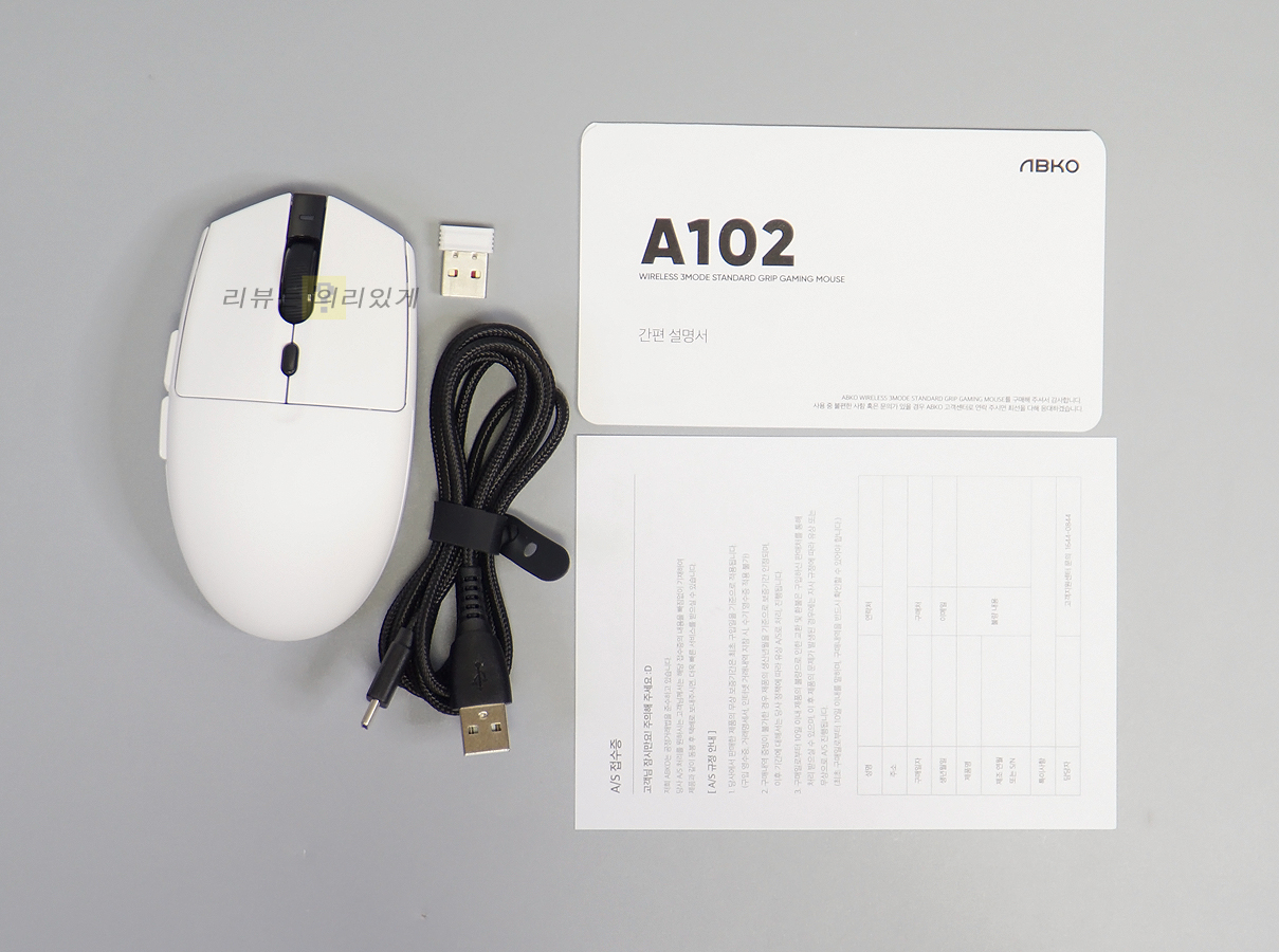 마우스 외에 2.4GHz 무선 동글, 충전 및 연결 케이블, 설명서, A/S 접수증이 구성품으로 제공됩니다.