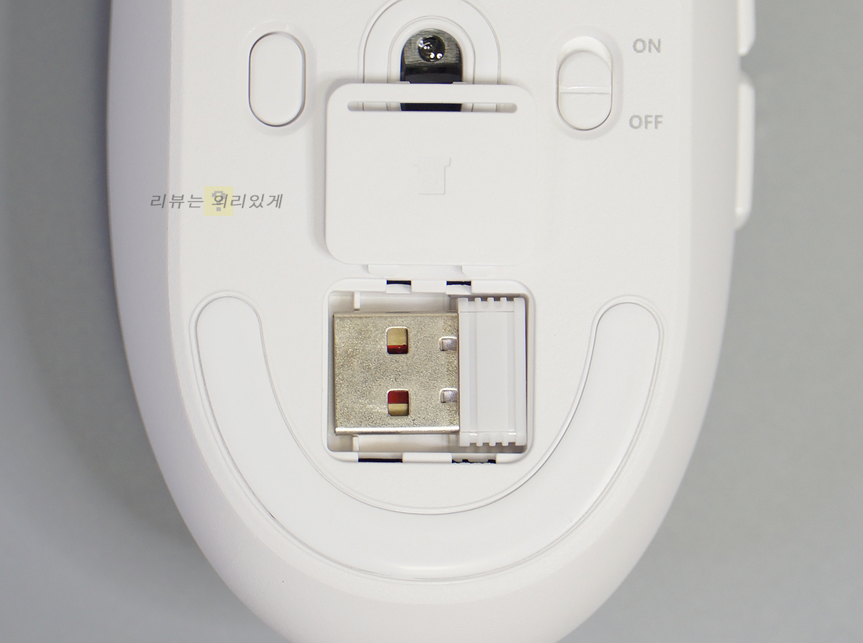 중앙에는 광센서가 있으며 무선 연결 설정을 위한 페어링 버튼과 전원 ON/OFF 버튼이 위치해 있습니다. 무선 동글은 하단에 전용 수납공간에 넣을 수 있습니다.