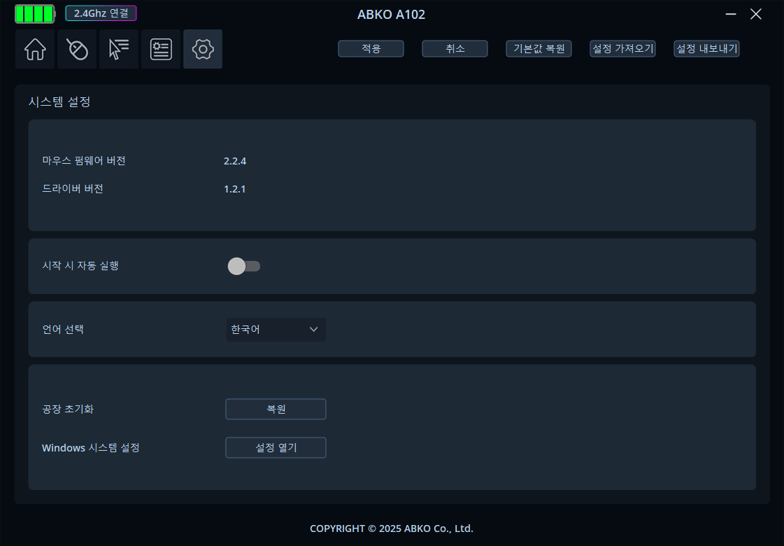 앱코 홈페이지에서 다운로드할 수 있습니다. 한국어를 지원하며 좌측 상단의 큰 메뉴와 우측의 세부 메뉴로 구분할 수 있습니다. 소프트웨어에서 배터리 잔량 확인할 할 수 있는데, % 표기가 아니라 4단계로 25%씩 보게 만들어 정밀도가 부족합니다.