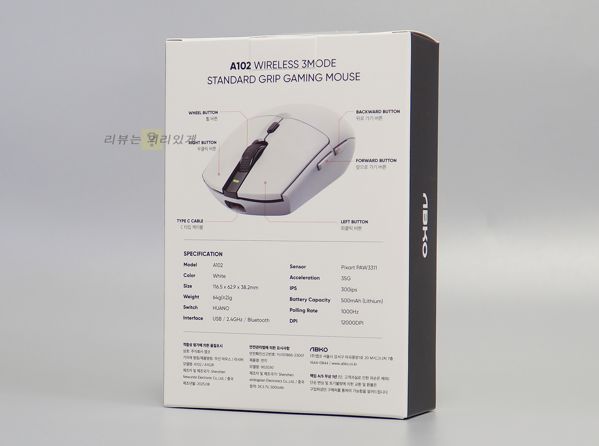 센서는 PAW-3311을 사용하고 있으며 스위치는 후아노 스위치를 사용하고 있습니다. A/S 보증기간은 1년을 지원합니다.