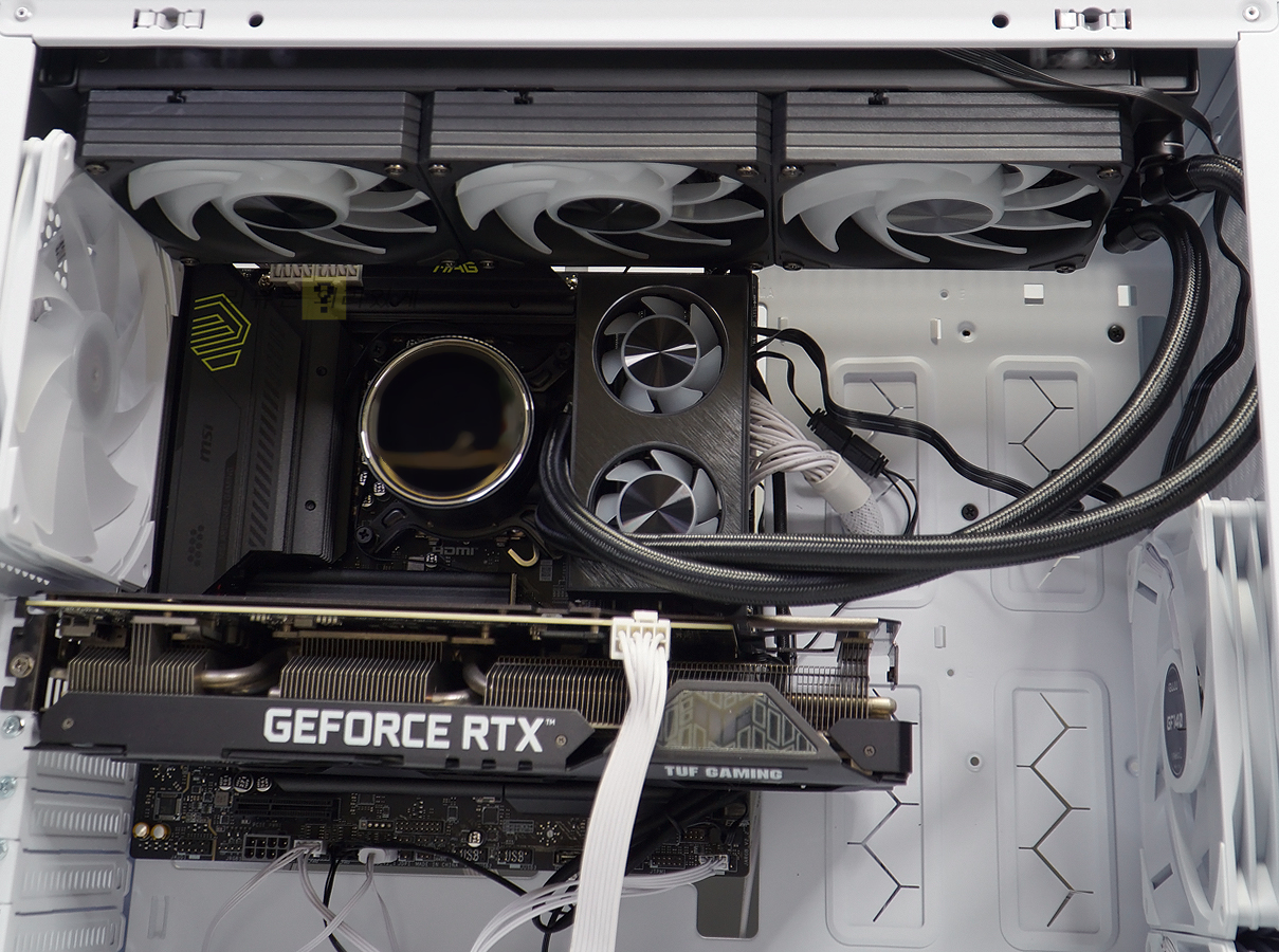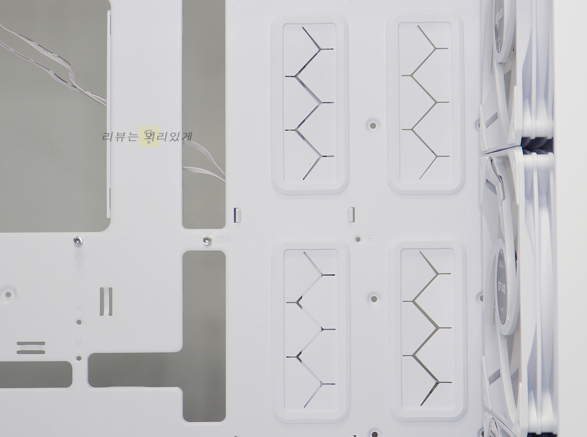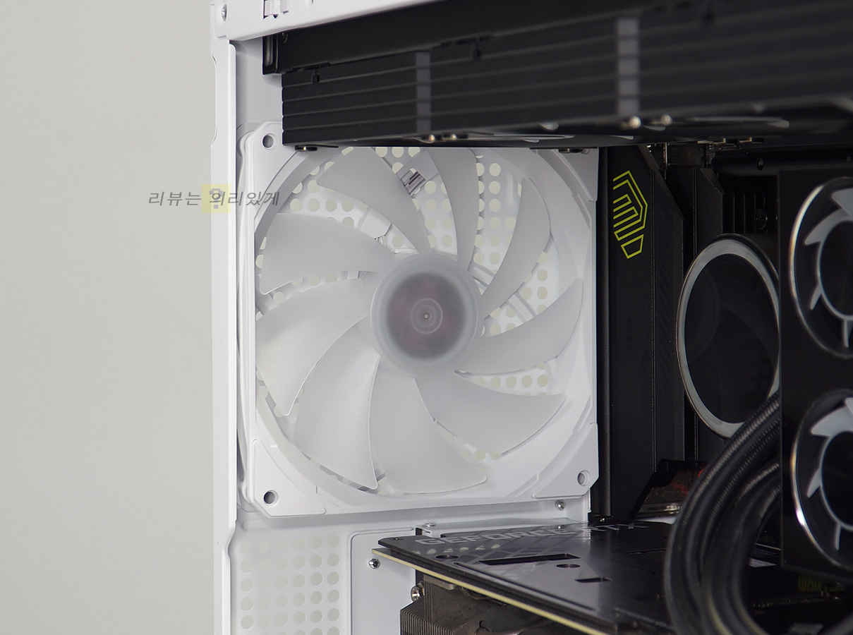 상단 수랭 쿨러 장착을 지원하고 있으나 360mm 라디에이터 장착을 위해서는 상단 팬을 제거해야 합니다. 또한 팬이 없다고 가정해도 여유 공간은 많지 않습니다.