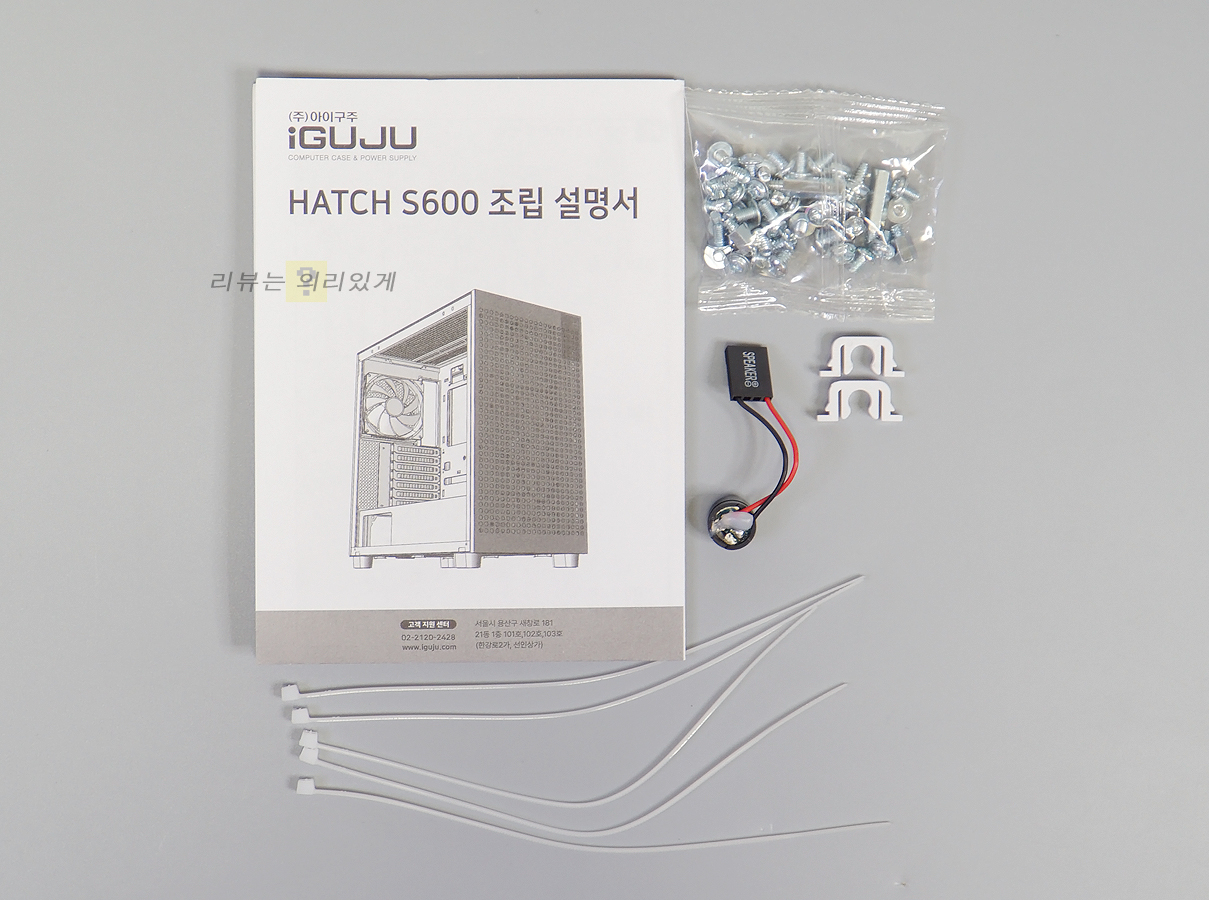 구성품으로 설명서, 조립 나사, 비프음 스피커, 케이블 타이, 클램프 부속품이 제공됩니다.