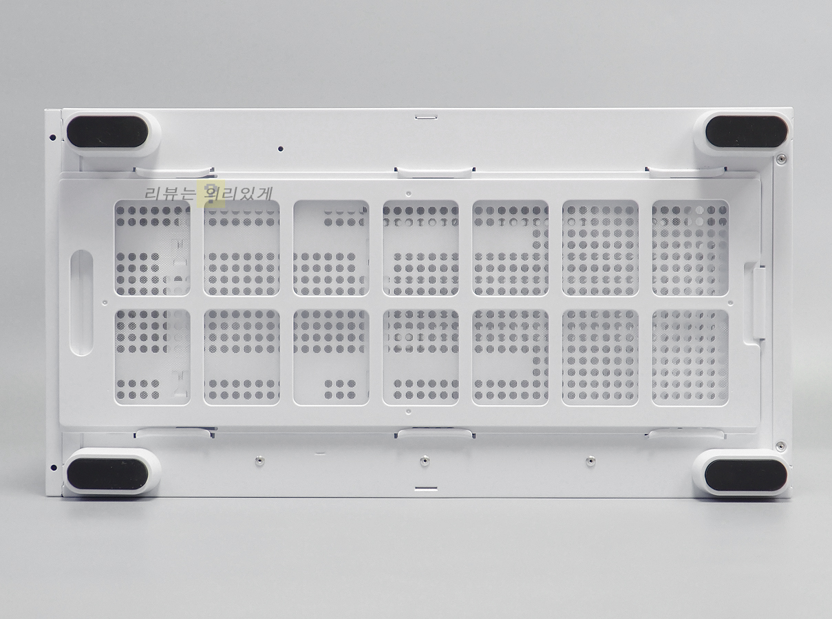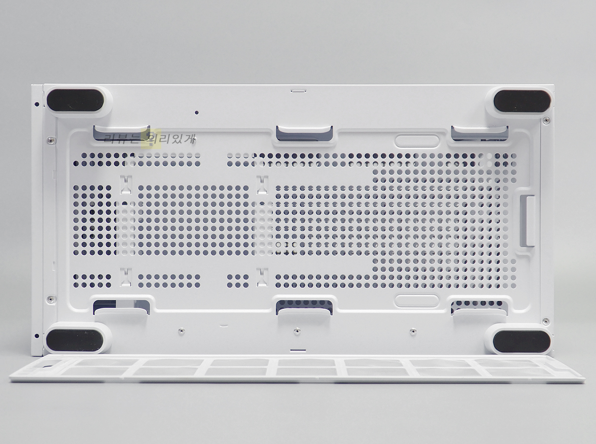 하단에는 쿨링을 위한 타공 구조와 슬라이드 방식의 먼지 필터가 부착되어 있습니다. 필터 테두리에 플라스틱을 부착하여 내구성을 강화하였습니다. 받침에는 미끄럼 방지를 위한 패드를 부착하였습니다.