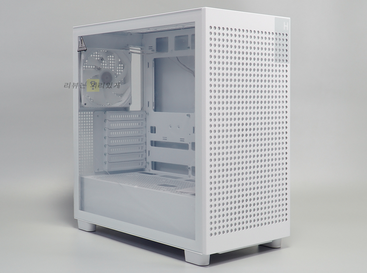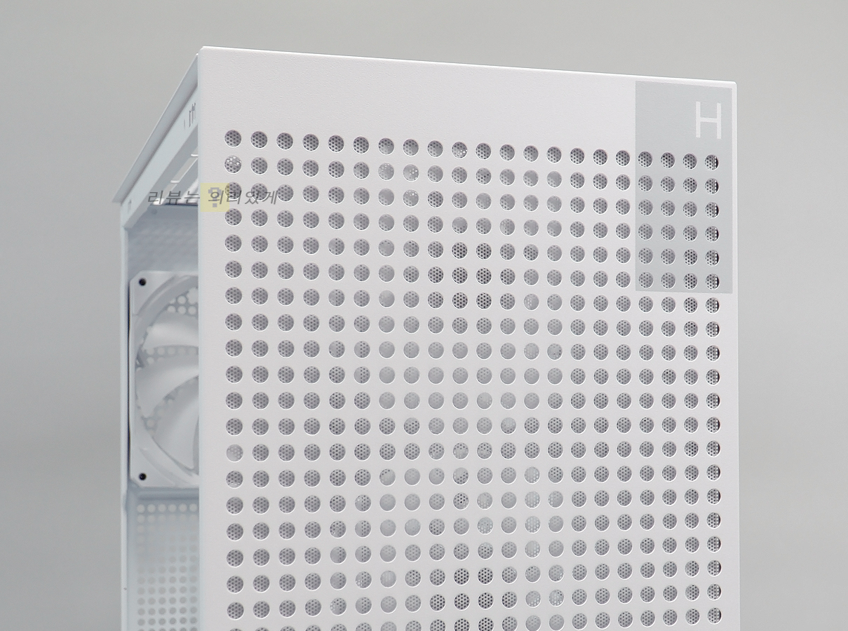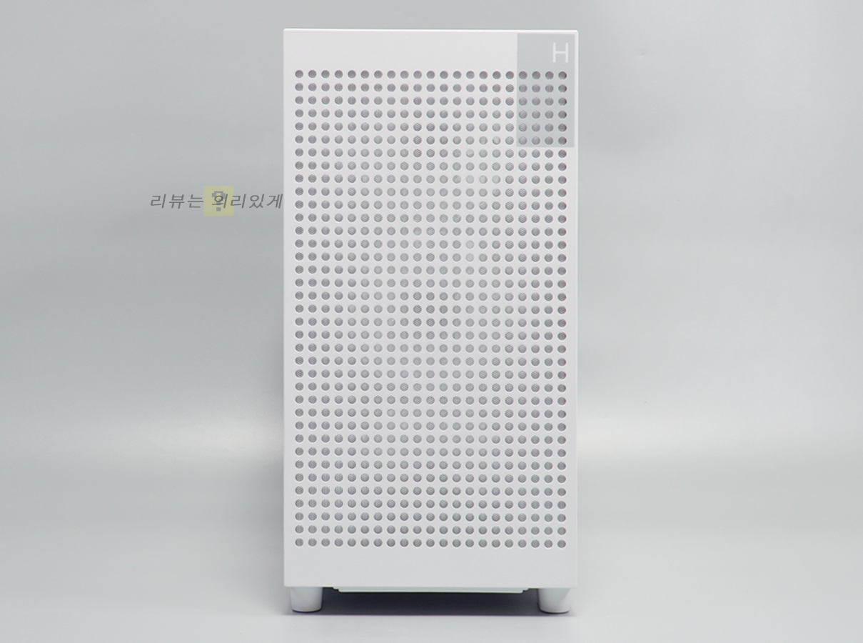 전면 패널 대부분은 일정 간격으로 메시 타공 구조가 적용되었으며, 우측 상단에 H와 작은 투톤 디자인을 추가하였습니다. 이러한 전면 타공 풀메시 디자인은 공기흐름이 최적화되어 방해 없이 케이스 내부로 흡입할 수 있습니다.
