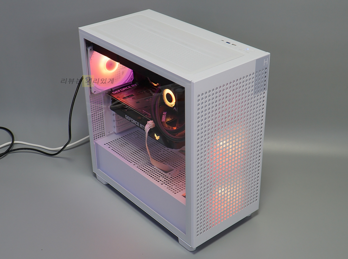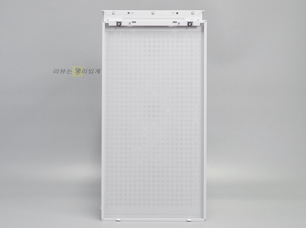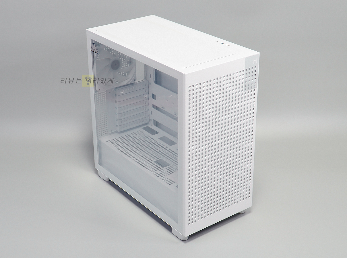 전면 패널 대부분은 일정 간격으로 메시 타공 구조가 적용되었으며, 우측 상단에 H와 작은 투톤 디자인을 추가하였습니다. 이러한 전면 타공 풀메시 디자인은 공기흐름이 최적화되어 방해 없이 케이스 내부로 흡입할 수 있습니다.