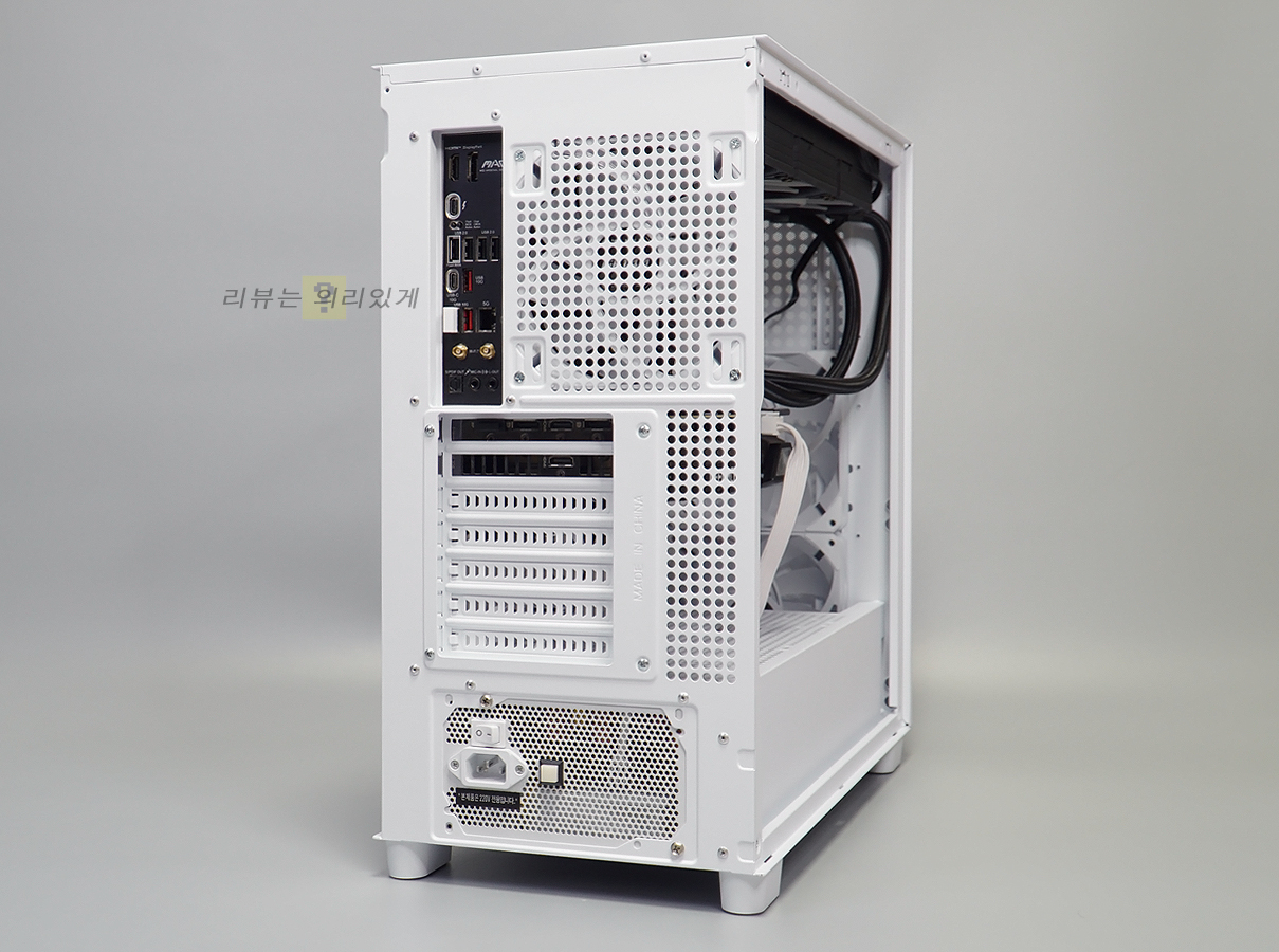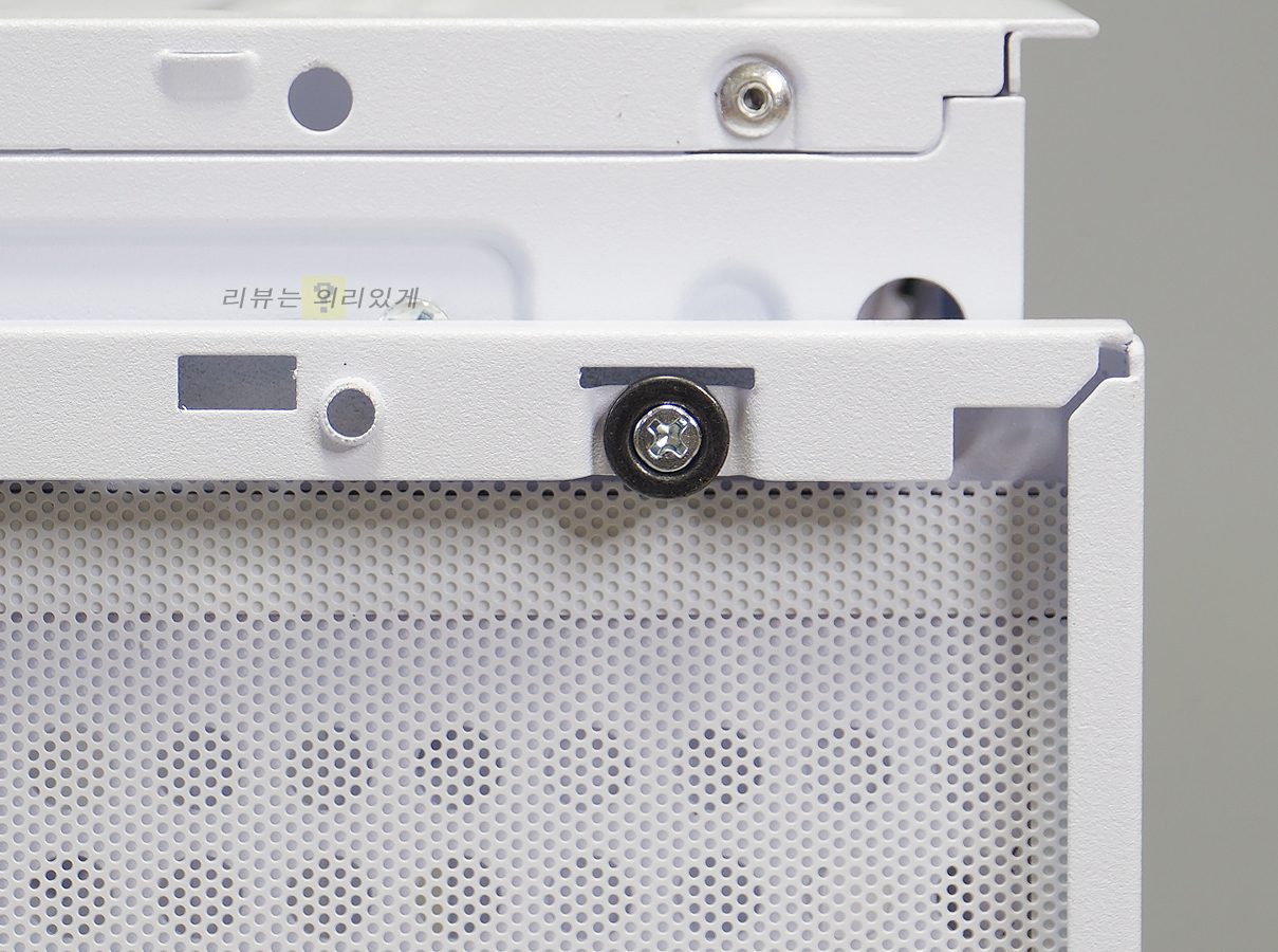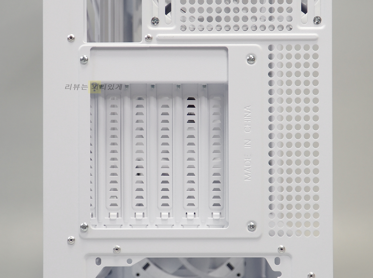 파워 서플라이 체임버에는 쿨링을 위한 타공망과 추가 팬 장착을 위한 공간이 제공됩니다. 그래픽카드 수직 장착을 지원하나 라이저 킷은 제공되지 않기 때문에 따로 구매해야 합니다. 나사를 분리한 후 방향을 돌려 수직 장착 방식으로 전환할 수 있습니다.