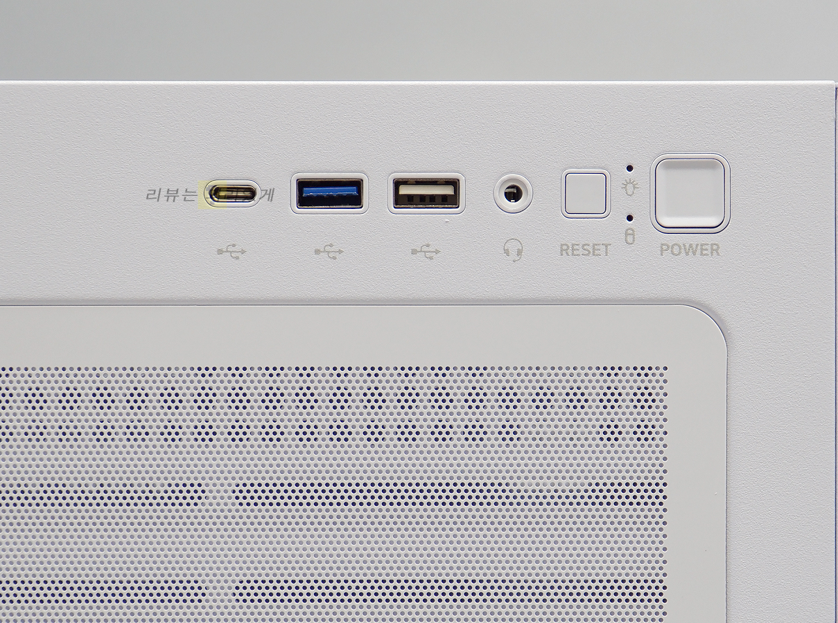 I/O 포트는 상단에 부착되어 있으며 USB Type C, USB 3.0, USB 2.0, 오디오, 리셋, 전원/저장 장치 표시등, 파워 버튼이 부착되어 있습니다.