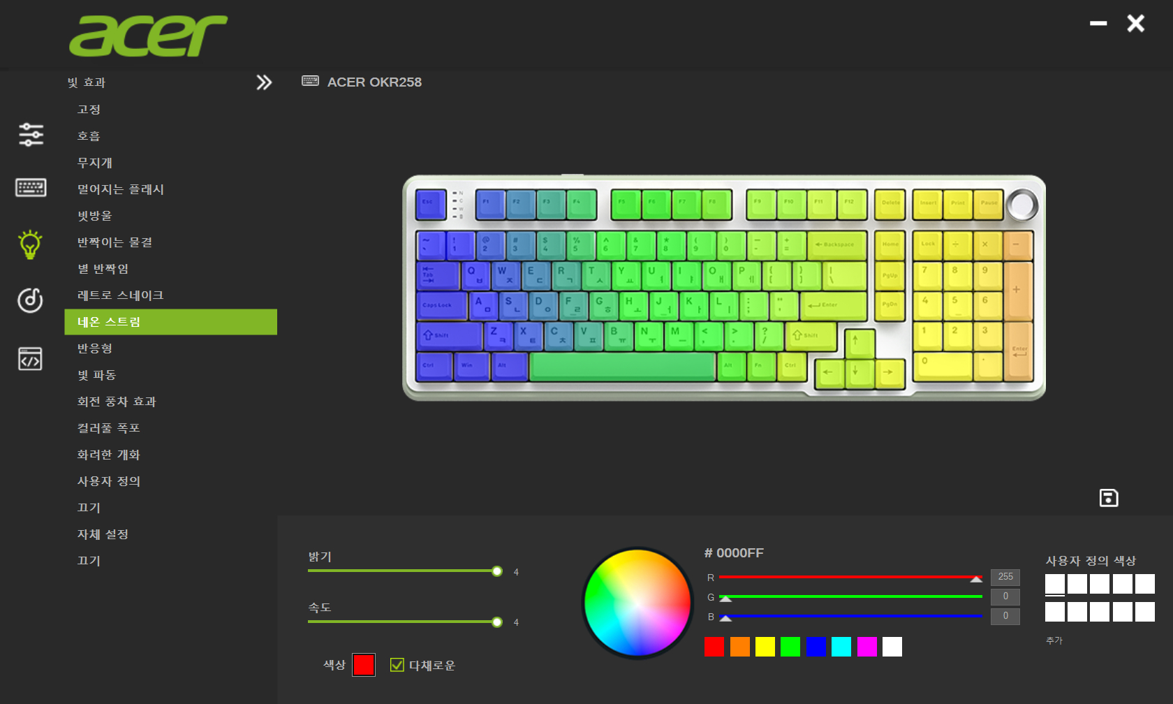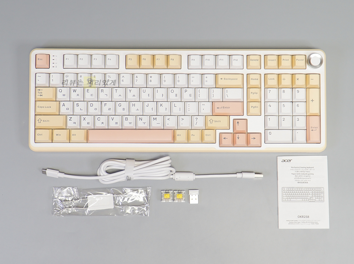 기계식 키보드를 사용할 때 어떤 스위치를 사용하는가에 따라 키압과 키감이 달라지기에 이를 확인하고 선택하게 됩니다. 마니아가 아니라면 무난한 것을 선택하게 되는데 일반적으로 이를 고려한 제품들이 많습니다. 에이서 OKR258은 3가지 색상과 2가지 스위치를 선택할 수 있게 하였는데 색상마다 이름처럼 상당히 개성이 있는 모습인데 스위치는 개성보다는 무난함과 사용하기 좋은 키압과 타건을 생각한 것으로 생각됩니다.