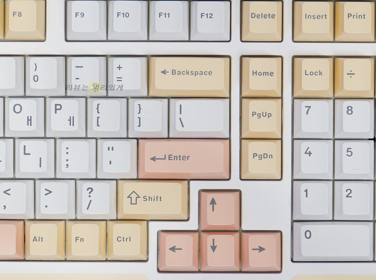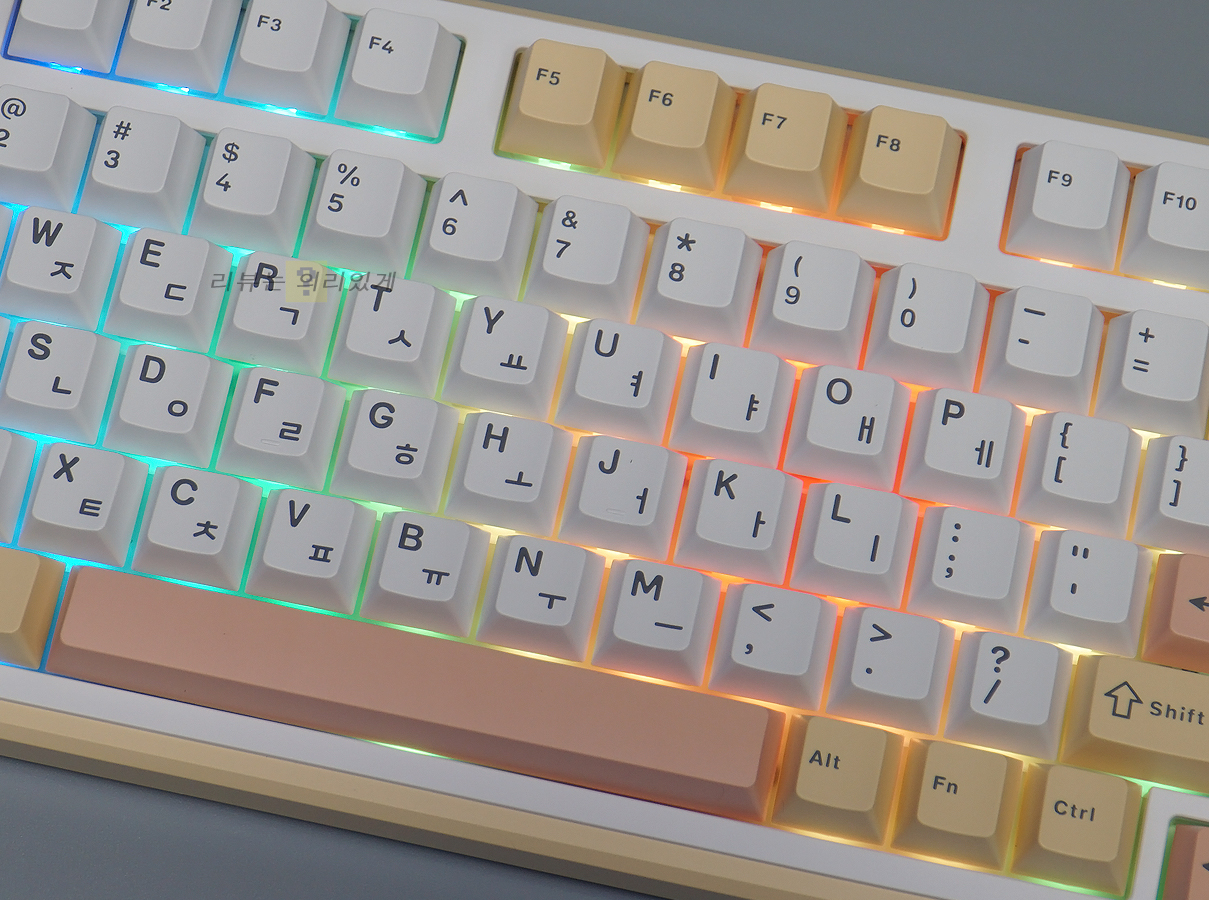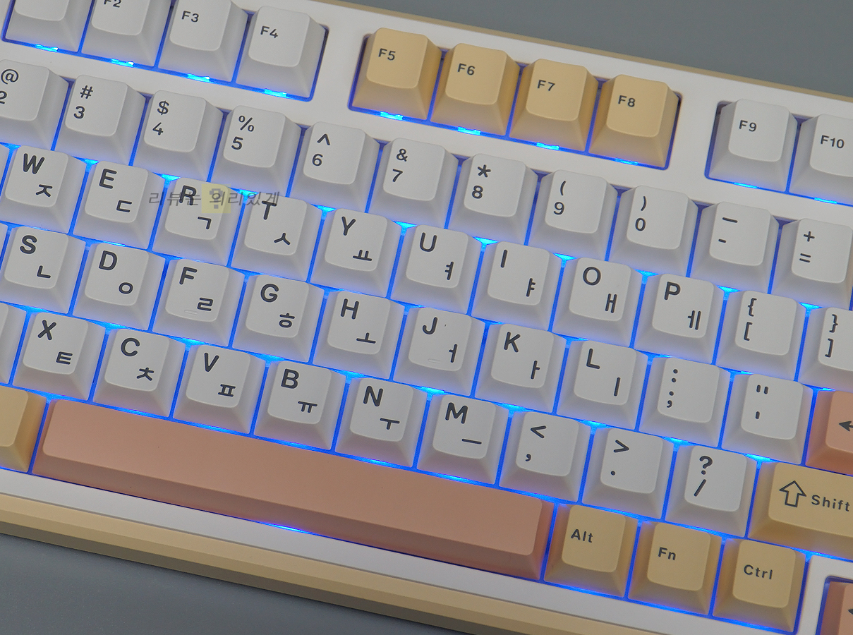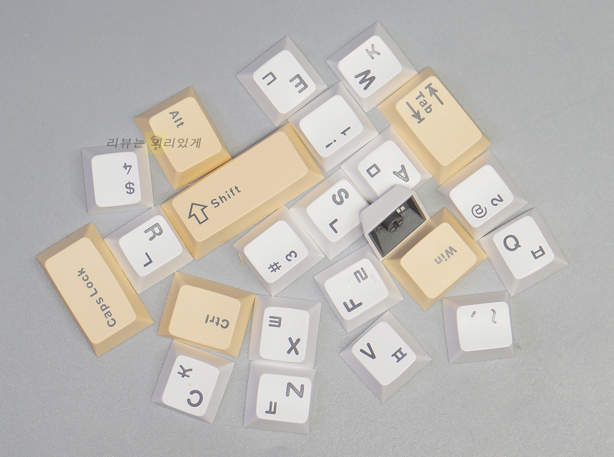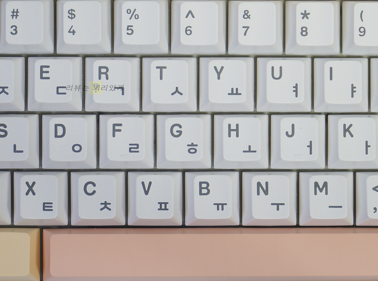 키캡 재질은 PBT이며 키캡 각인 방식은 이중 사출 방식이 사용되었습니다. 각인 위치는 한/영 정각입니다.