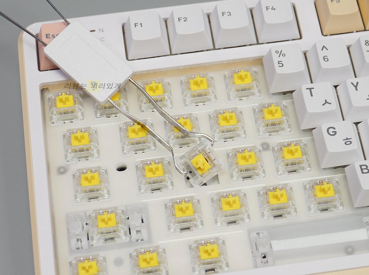 구성품으로 제공하는 키캡/스위치 리무버를 사용해 키캡과 스위치를 분리할 수 있습니다. 구성품으로 여분의 스위치 2개를 제공하고 있기 때문에 사용 중 고장이 발생할 경우 바로 교체할 수 있어 편리합니다.