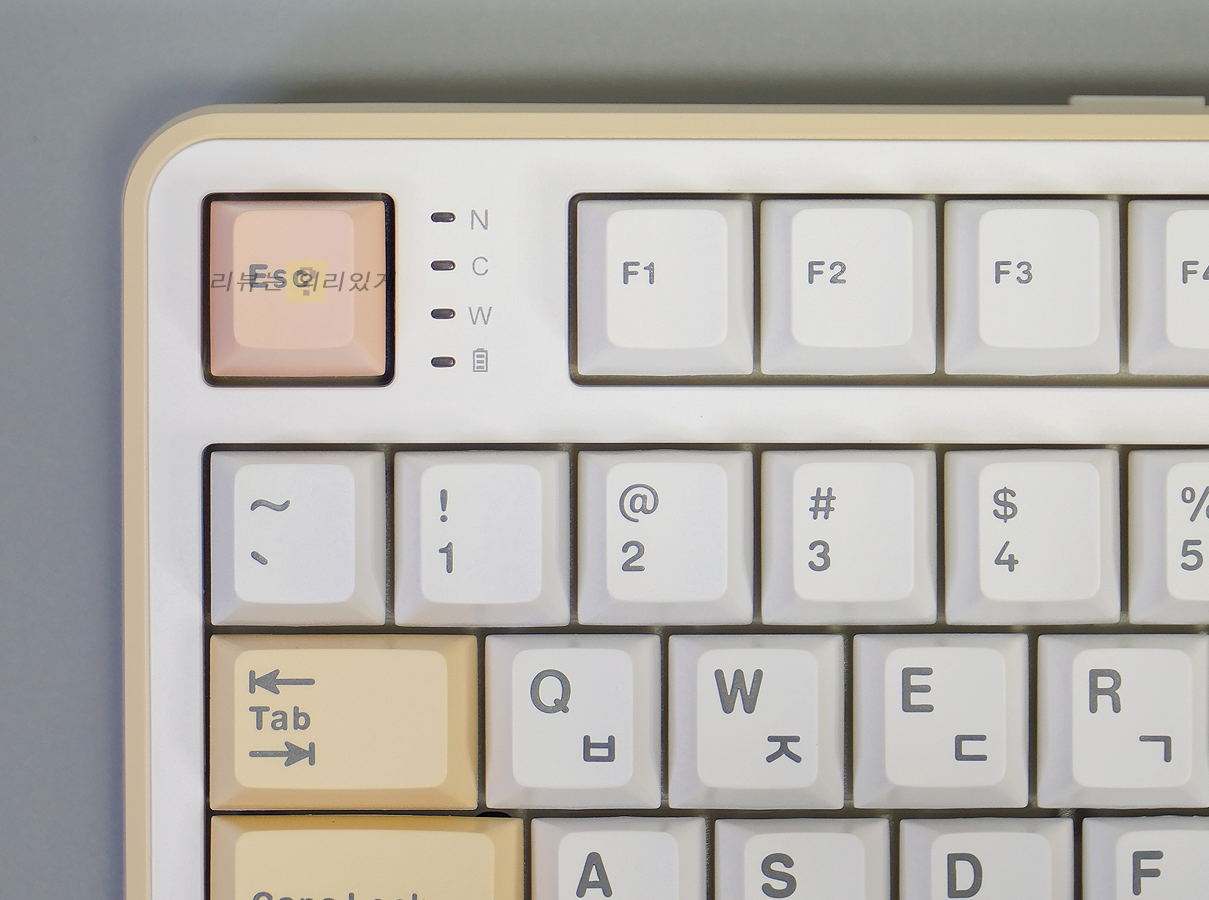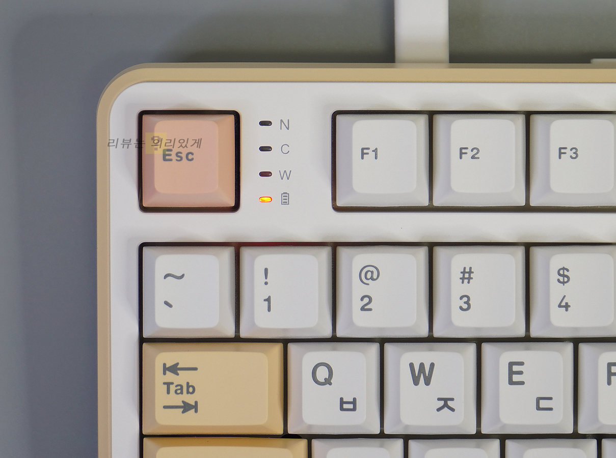 멀티미디어 기능을 지원하고 있으나 별도로 표시하지는 않았습니다. 외형적으로 보기에는 좋을지 모르나 기능적으로는 어떤 키가 어떤 기능을 지원하는지 확인이 필요하므로 아쉽게 느낄 수 있습니다. ESC 키 우측에는 상태 표시등이 위치해 있으며 배터리 충전 상태를 확인할 수 있게 하였습니다.