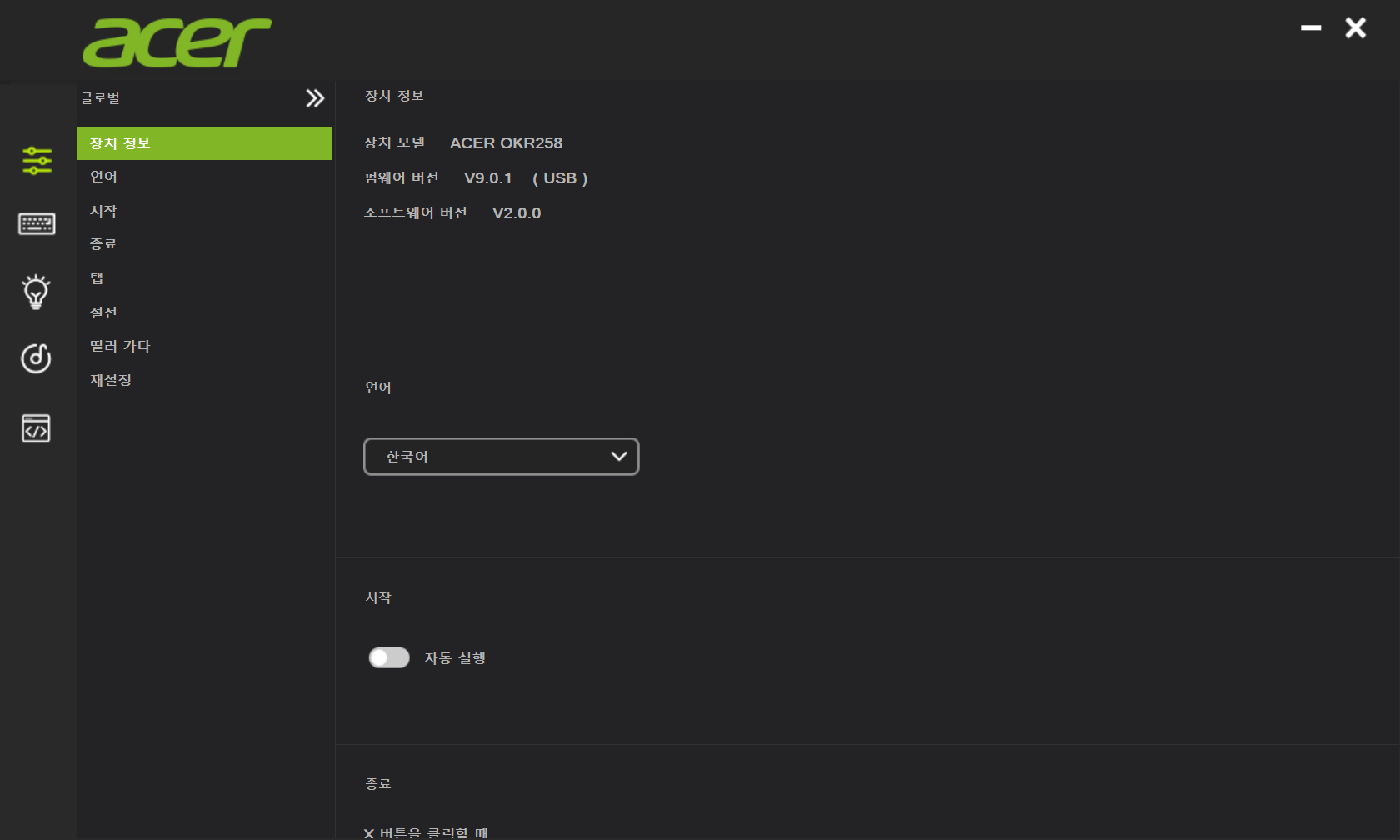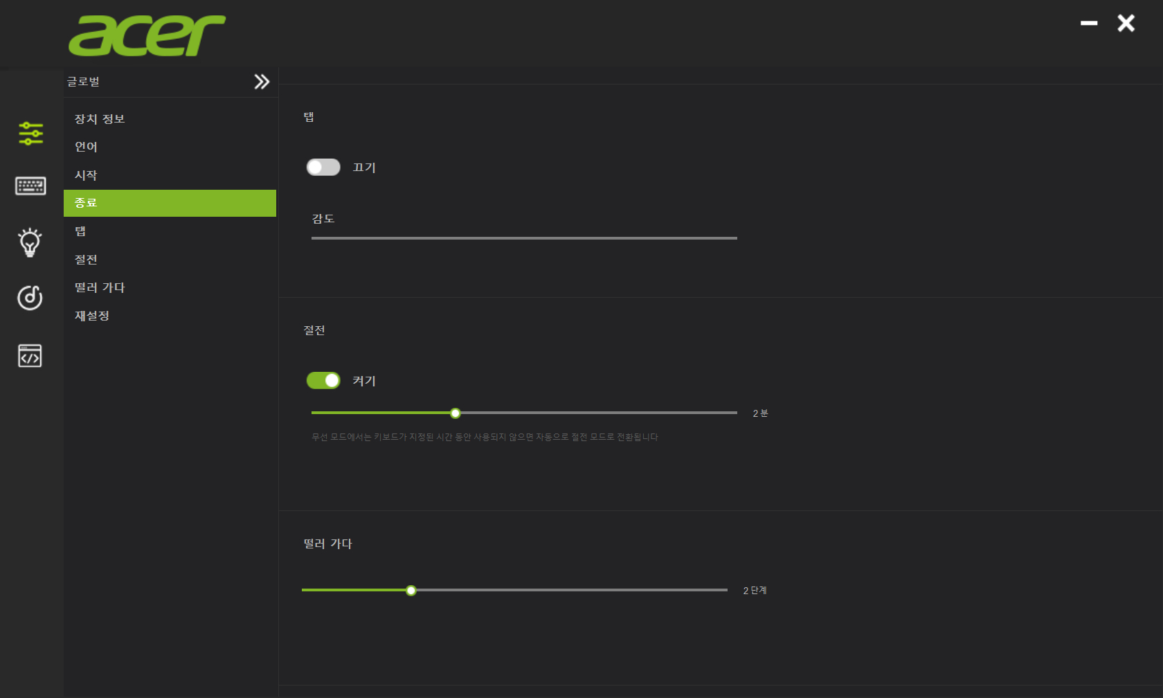 상품 정보에서 언급한 바와 같이 에이서 키보드 마우스 카페에서 다운로드할 수 있습니다. 한국어를 포함한 여러 언어를 지원하고 있습니다. 좌측의 큰 메뉴와 우측 세부 옵션으로 구분할 수 있습니다. 무선 제품으로 사용되는 만큼 절전 모드를 포함해 여러 기능을 지원하고 있는데 한국어의 경우 일부분이 번역기를 사용한 것을 검수 없이 그대로 사용하는 것 같아 보입니다.