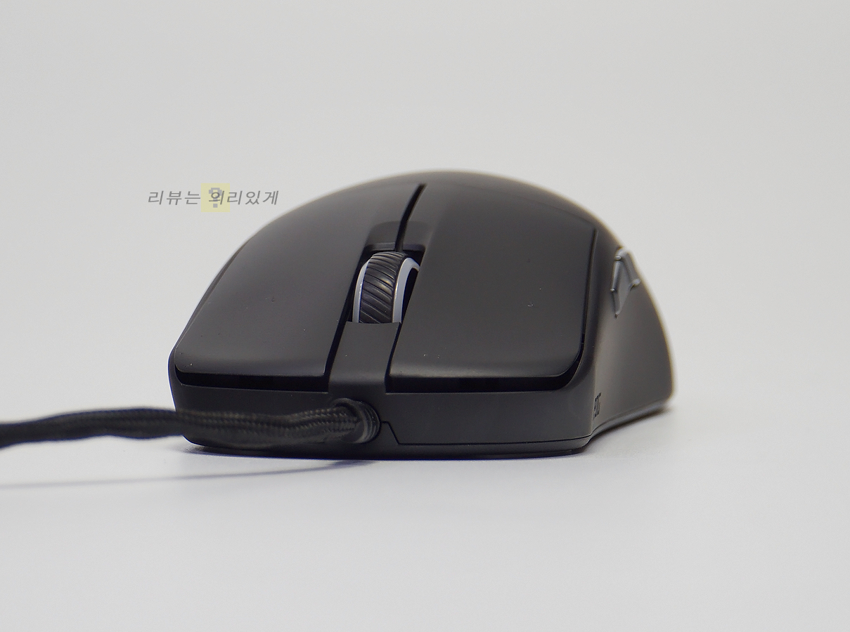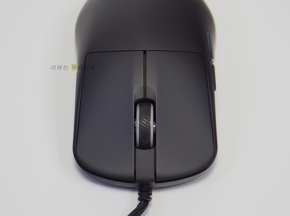 케이블은 분리형이 아닌 일체형 방식이 채택되었으며 단선 방지를 위해 단선 방지 몰딩 처리를 하였습니다. 휠 버튼에는 미끄럼 방지를 위한 패턴 무늬가 추가되었으며 DPI 버튼은 상단이 아닌 하단에 부착되어 있습니다. DPI 버튼을 자주 사용하고 있다면 아쉽게 느껴질 수 있습니다.