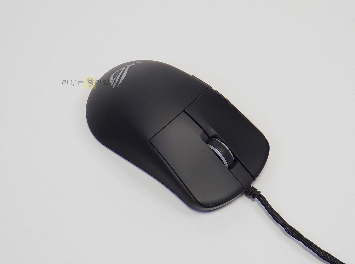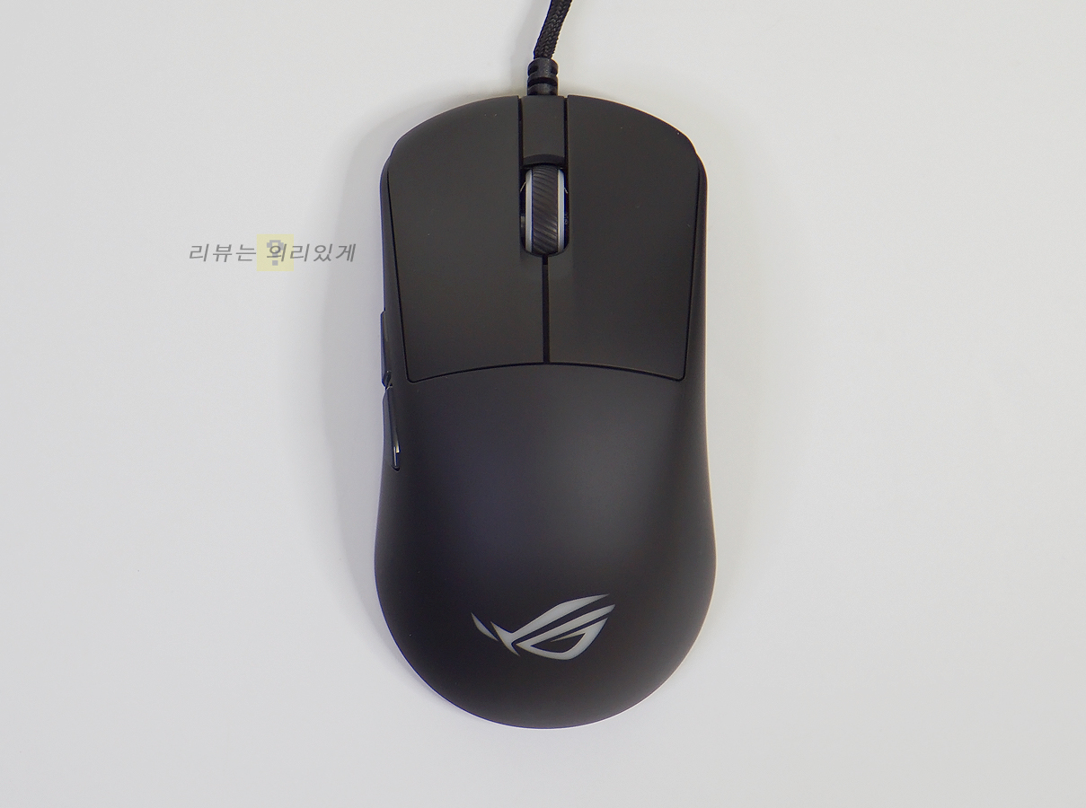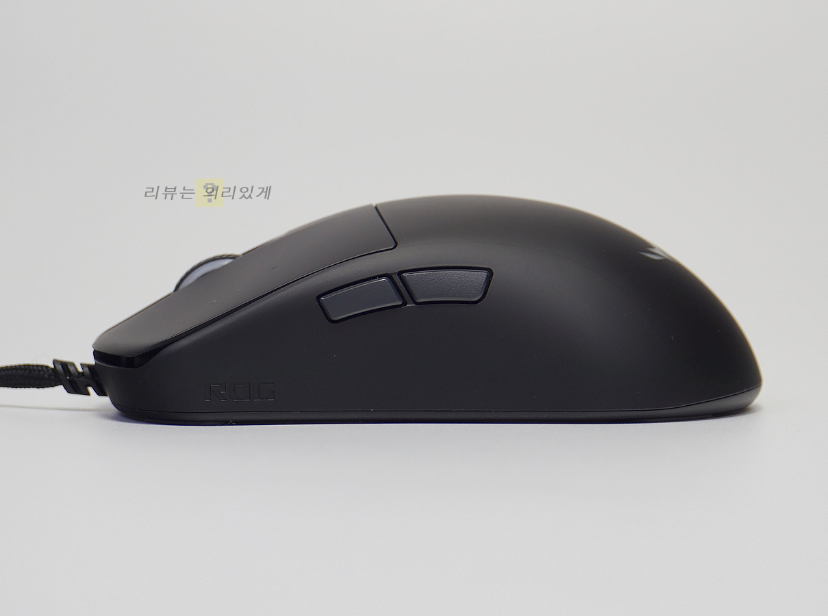 좌, 우가 동일한 대칭형 디자인과 무광 블랙 색상이 사용되었습니다. 기능 버튼이 오른쪽에 있어 오른손 잡이 전용이라 볼 수 있습니다. 무게는 약 52g으로 가벼운 편이나 솔리드 쉘 구조로 흔히 말하는 벌집형 구조 없이 일반적인 마우스 디자인을 적용하였습니다. 좌/우 버튼은 본체 쉘과 분리되어 있어 구분감이 있습니다. 후면에는 에이수스 로그 로고를 추가하여 해당 제품이 로그 시리즈라는 것을 보여주고 있습니다.