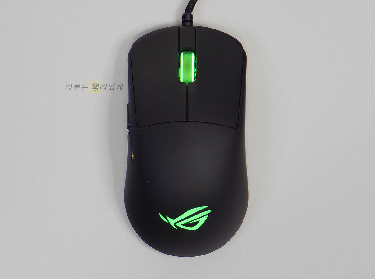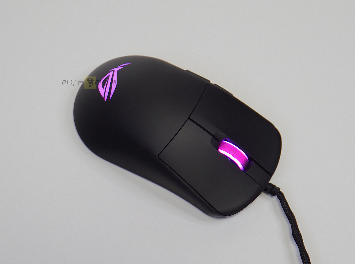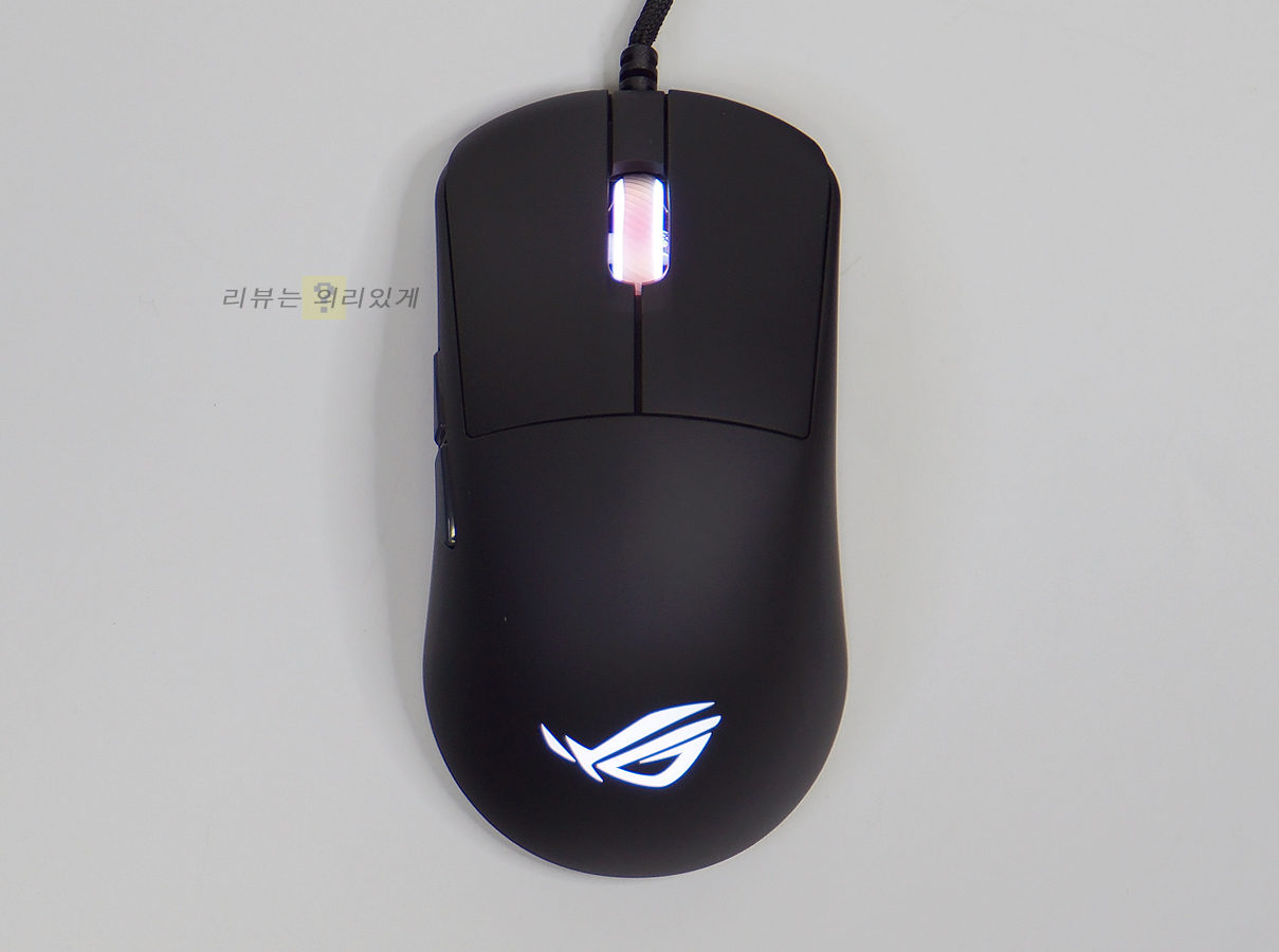 좌, 우가 동일한 대칭형 디자인과 무광 블랙 색상이 사용되었습니다. 기능 버튼이 오른쪽에 있어 오른손 잡이 전용이라 볼 수 있습니다. 무게는 약 52g으로 가벼운 편이나 솔리드 쉘 구조로 흔히 말하는 벌집형 구조 없이 일반적인 마우스 디자인을 적용하였습니다. 좌/우 버튼은 본체 쉘과 분리되어 있어 구분감이 있습니다. 후면에는 에이수스 로그 로고를 추가하여 해당 제품이 로그 시리즈라는 것을 보여주고 있습니다.