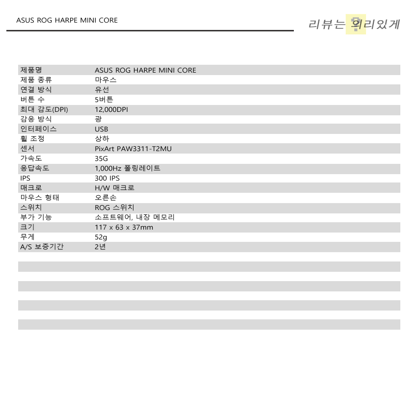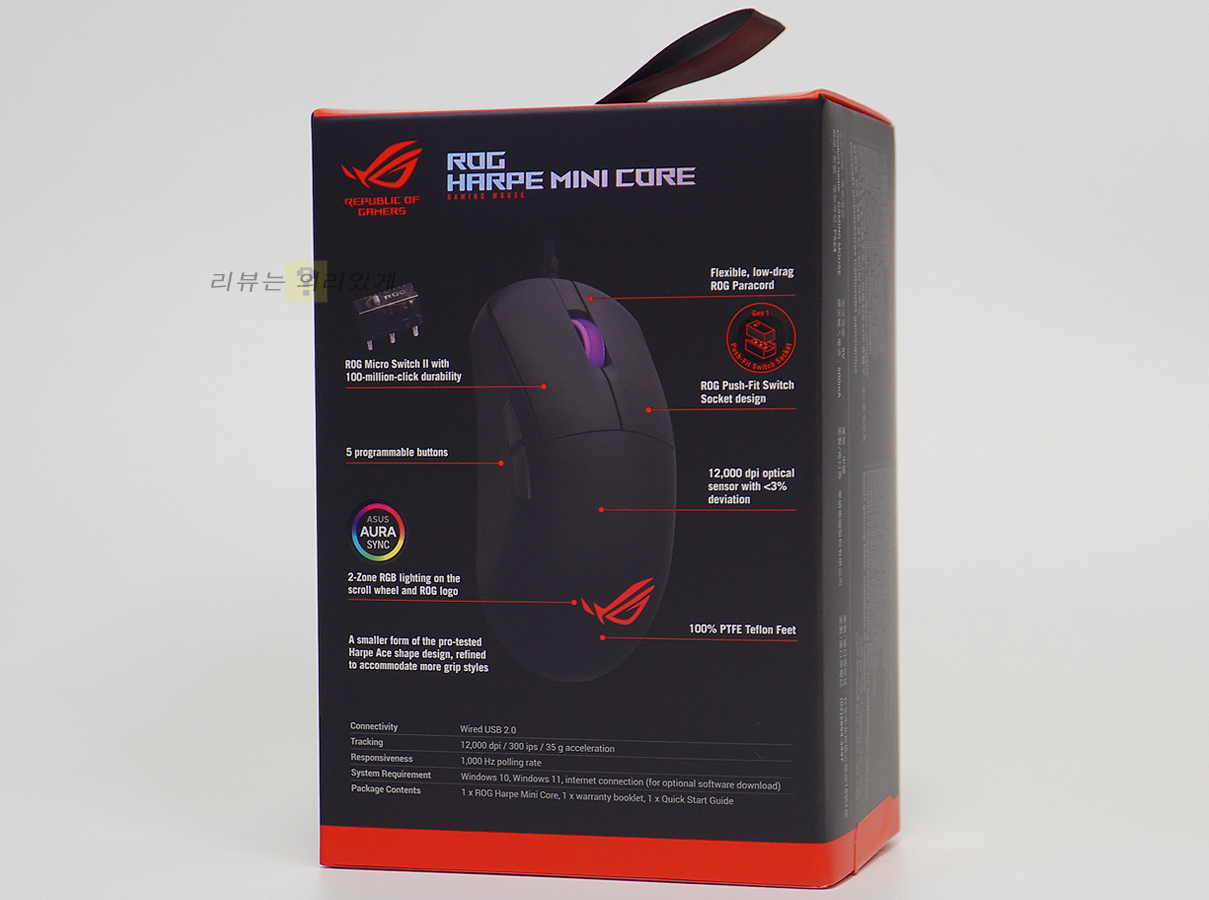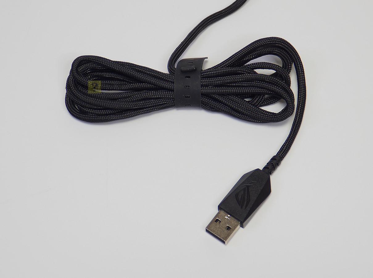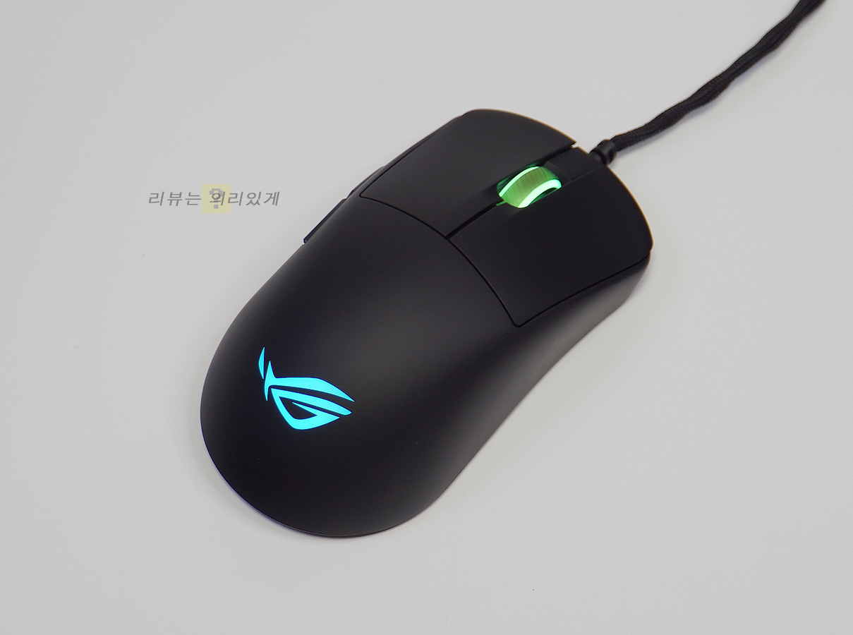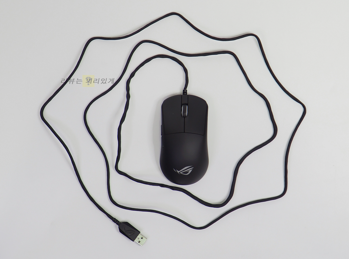 마우스 커버는 단순하게 보면 그립을 위한 것도 있지만 내부 PCB를 보호하기 위한 목적도 생략해야 하므로 후자를 선호하는 사람들도 적잖이 있습니다. ASUS ROG HARPE MINI CORE는 일반 마우스 디자인을 유지시키면서 52g의 가벼운 무게를 보여주는 경량 마우스입니다. 이와 함께 기존 케이블 대비 가볍고 유연한 파라코드 케이블이 사용되었는데 2m의 길이로 상당히 넉넉한 편입니다.