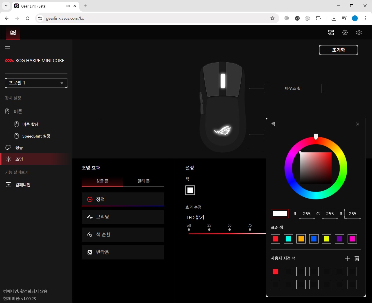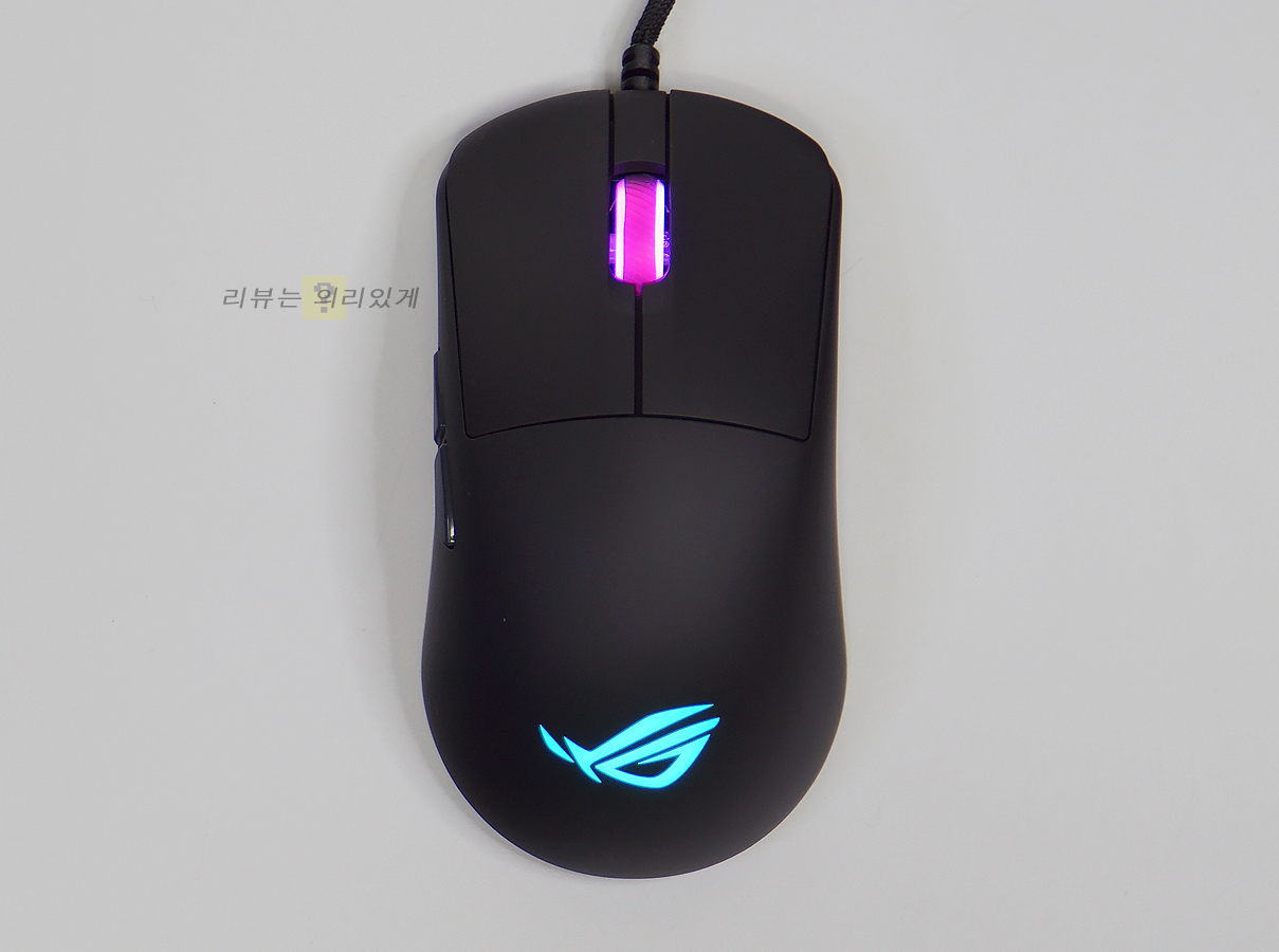 소프트웨어인 Gear Link를 사용해 모드, 색상, 밝기 등을 제어할 수 있습니다. 점등 부위는 마우스 휠과 ROG 로고이며 두 곳 모두 동일한 색상으로 점등시키거나 서로 다른 색상으로 변경시킬 수도 있습니다. RGB 조명 효과를 지원하고 있으나 레인보우 모드와 같이 여러 색이 한 번에 나오는 것은 지원하지 않습니다.