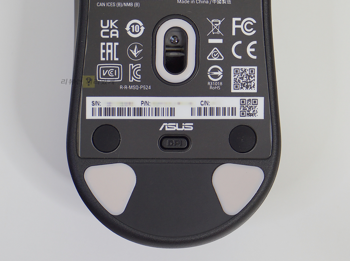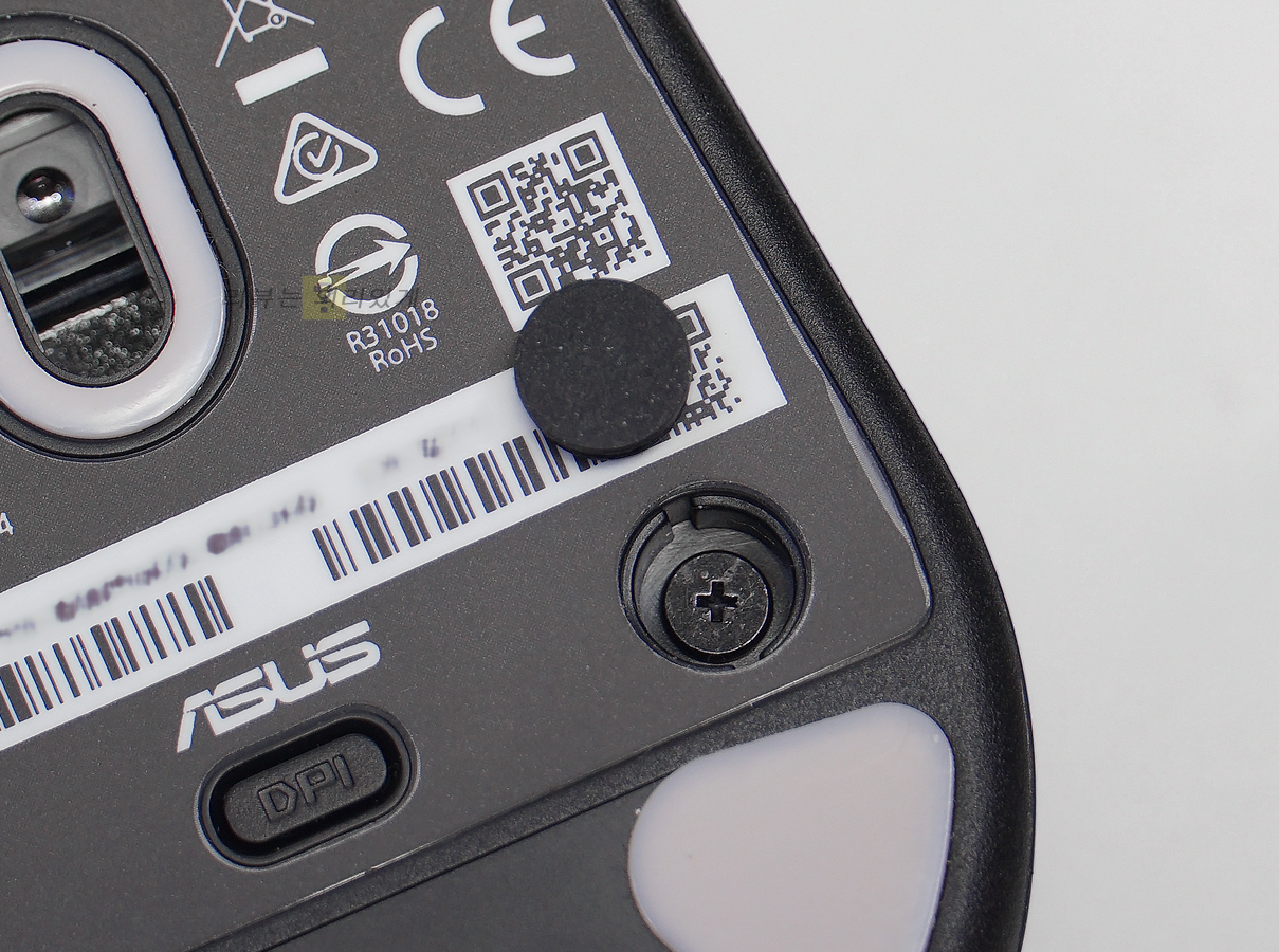 바닥의 테플론 피트는 삼각형 모양의 무언가를 연상시키는 형태이며 크기가 작은 편입니다. 덕분에 모든 방향으로 부드러운 글라이딩이 가능하다는 것이 상품 정보 설명입니다. 위에서 언급한 바와 같이 DPI 버튼은 하단에 위치해 있어 접근성이 좋지 못합니다. 또한 양쪽에는 스위치 교체를 위해 분해가 편하도록 패드로 나사 홀을 덮어놓았습니다.