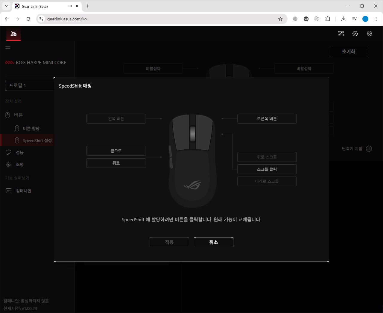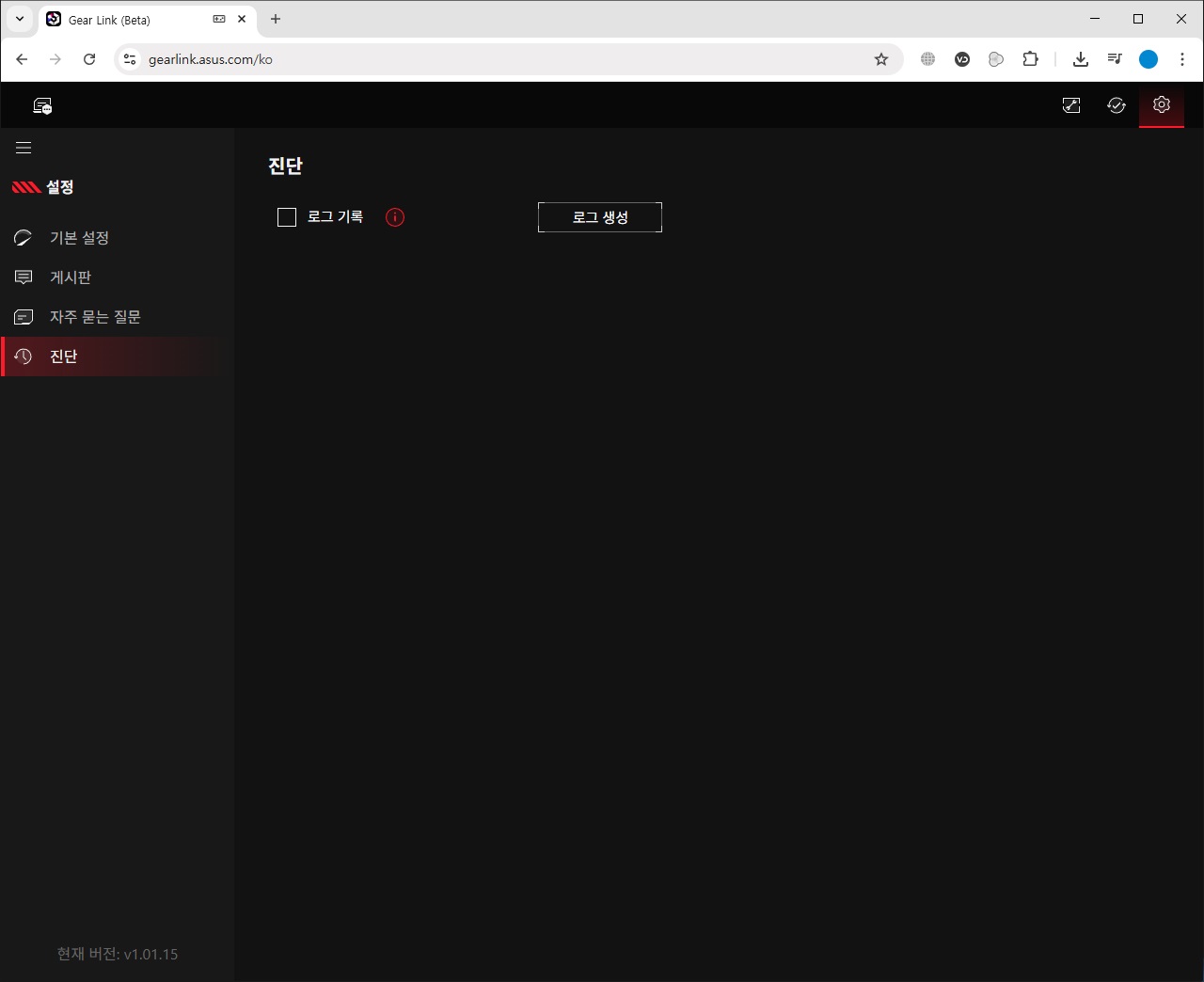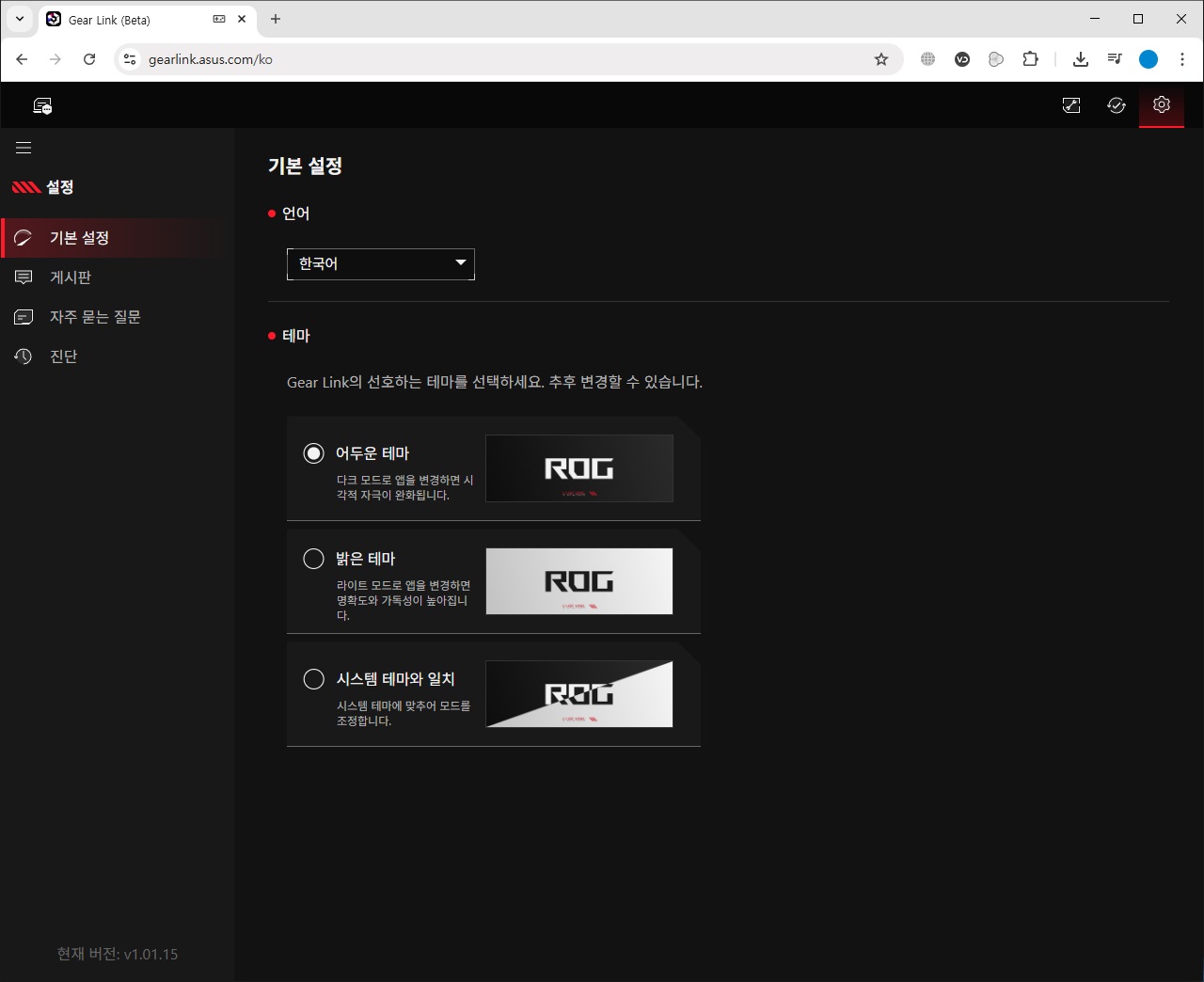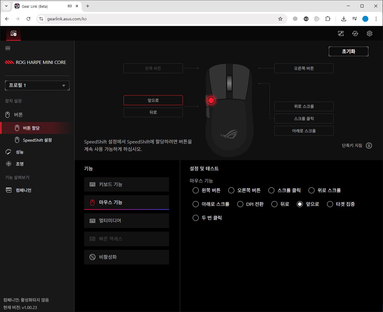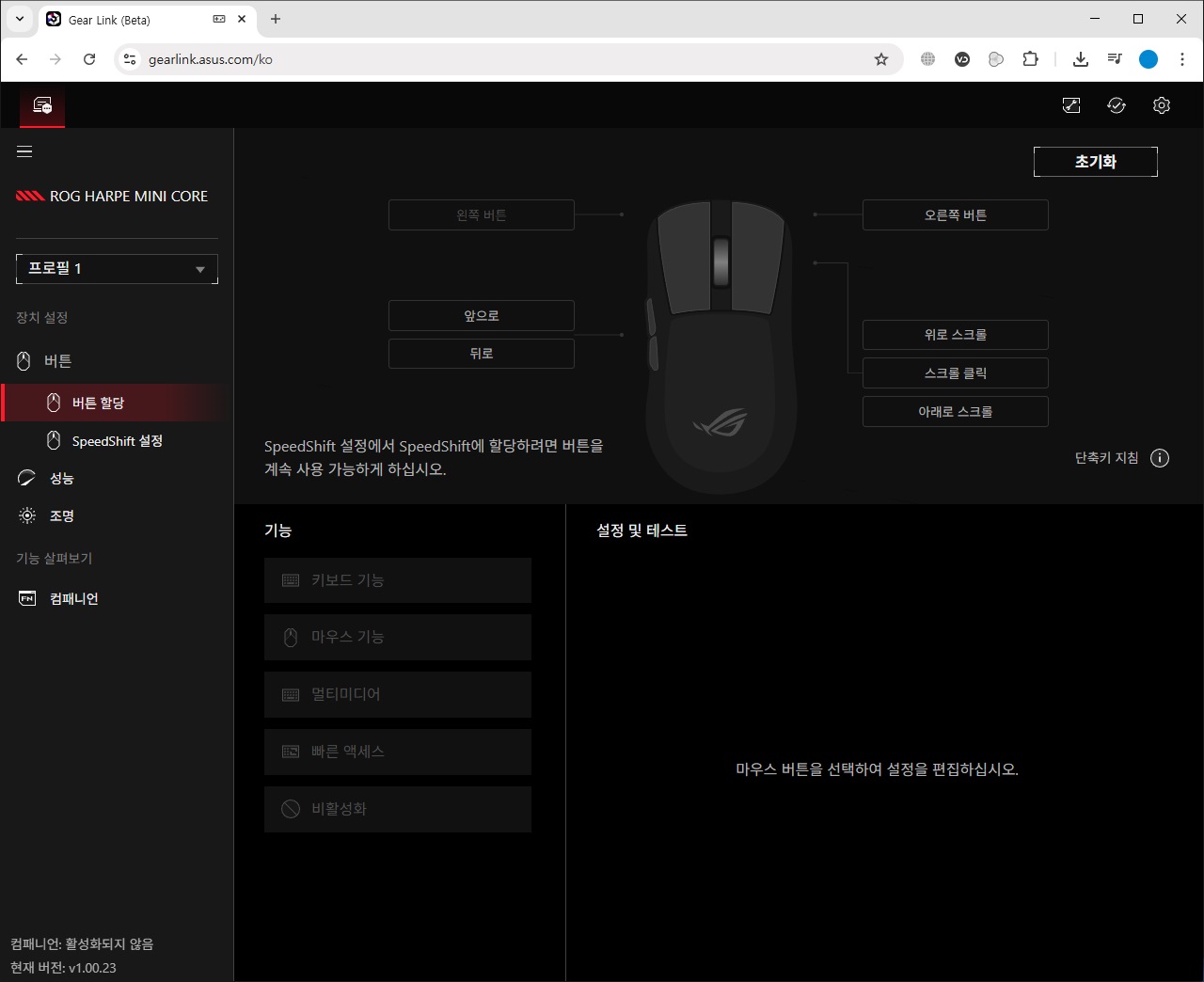 설정에서는 마우스와 관련된 추가적인 컴패니언 소프트웨어의 다운로드를 지원하는 컴패니언 소프트웨어와 펌웨어 업데이트, 언어 및 테마 변경을 지원하는 기본 설정, 소프트웨어/펌웨어 정보 확인, 로그 파일을 생성하여 장치 문제 발생 시 진단 정보를 볼 수 있는 진단 기능을 확인할 수 있습니다.