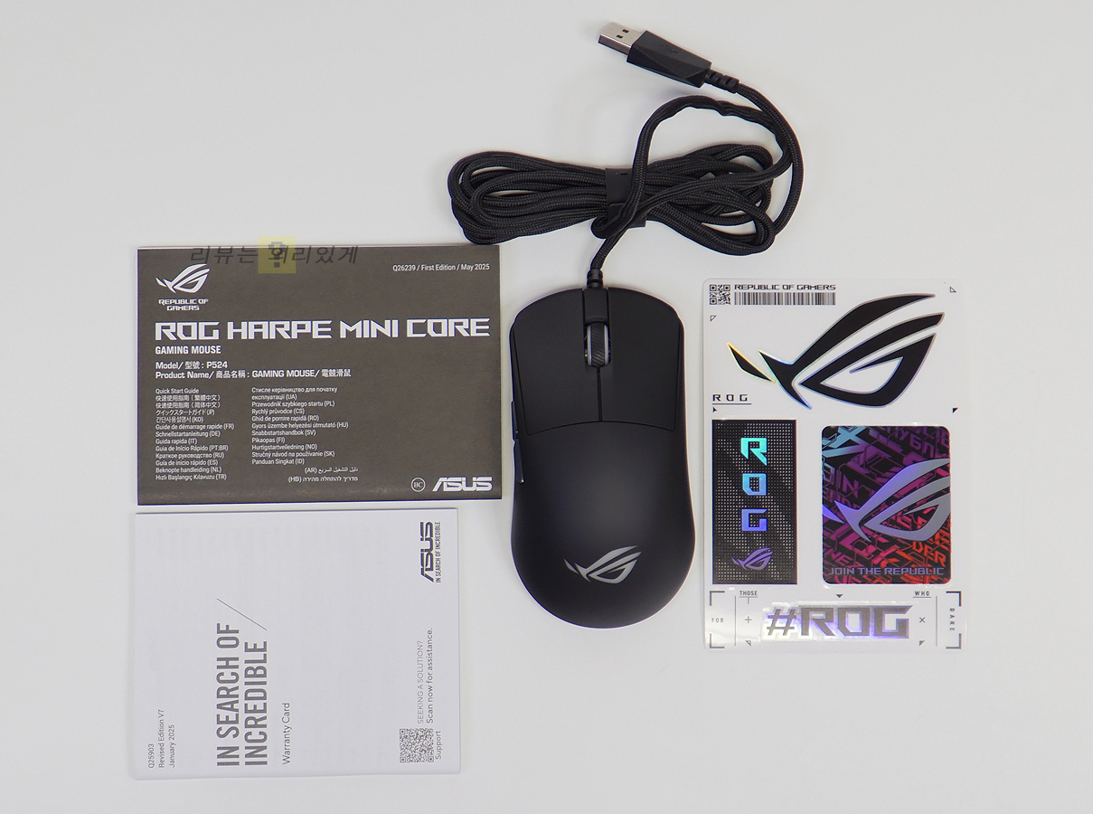 마우스, 퀵 스타트 가이드, 워런티 카드, 그립 테이프가 구성품으로 제공됩니다.