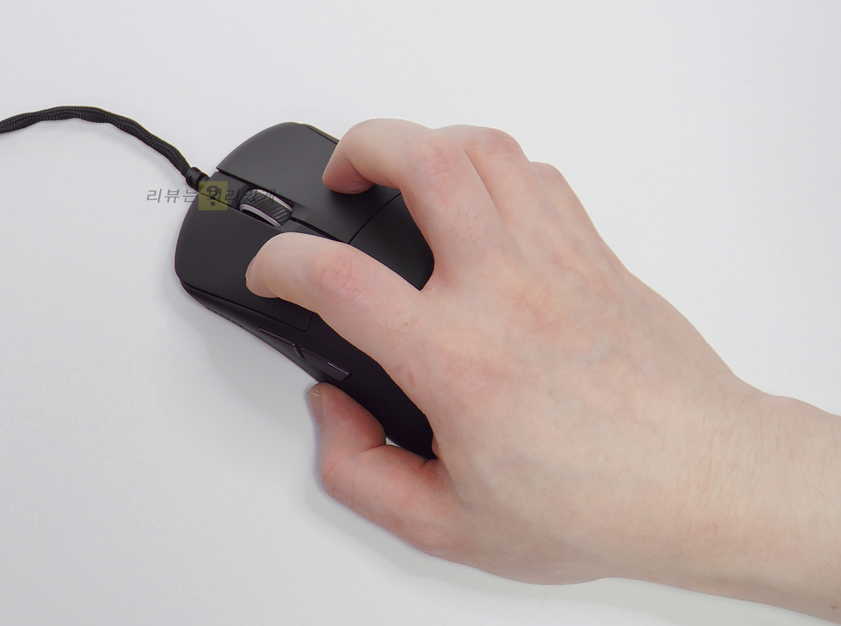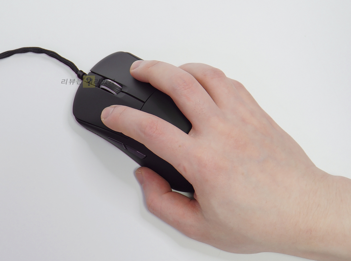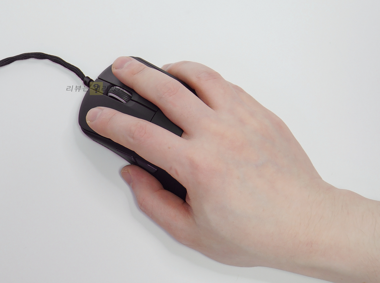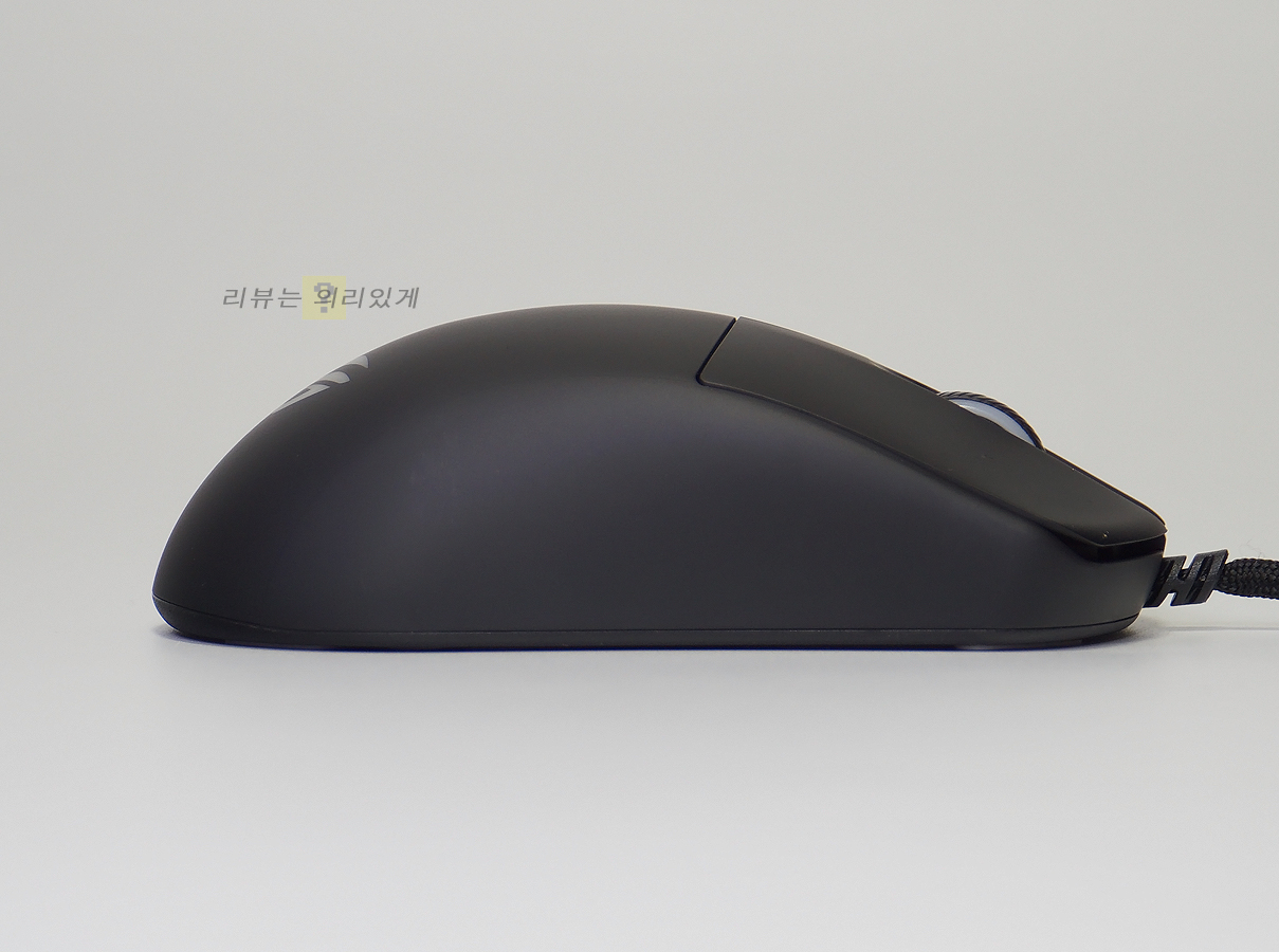 제품명에 미니라는 이름이 붙은 만큼 크기가 일반적인 게이밍 마우스와 비교하면 약간 작은 편입니다. 대체로 대부분 3가지 그립법 모두 만족할 수 있을지도 모르지만 손이 큰 사람이 사용할 경우 팜 그립과 같이 특정 그립이 불편할 가능성도 염두에 두어야 합니다. 양쪽 측면에는 그립을 위한 패턴 무늬나 추가 요소는 없었지만 전체적으로 미끄럽지 않아 만족스러웠지만 재질 특성상 이물질에 취약해 보였습니다.