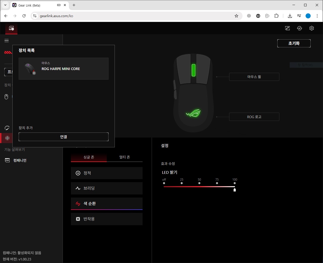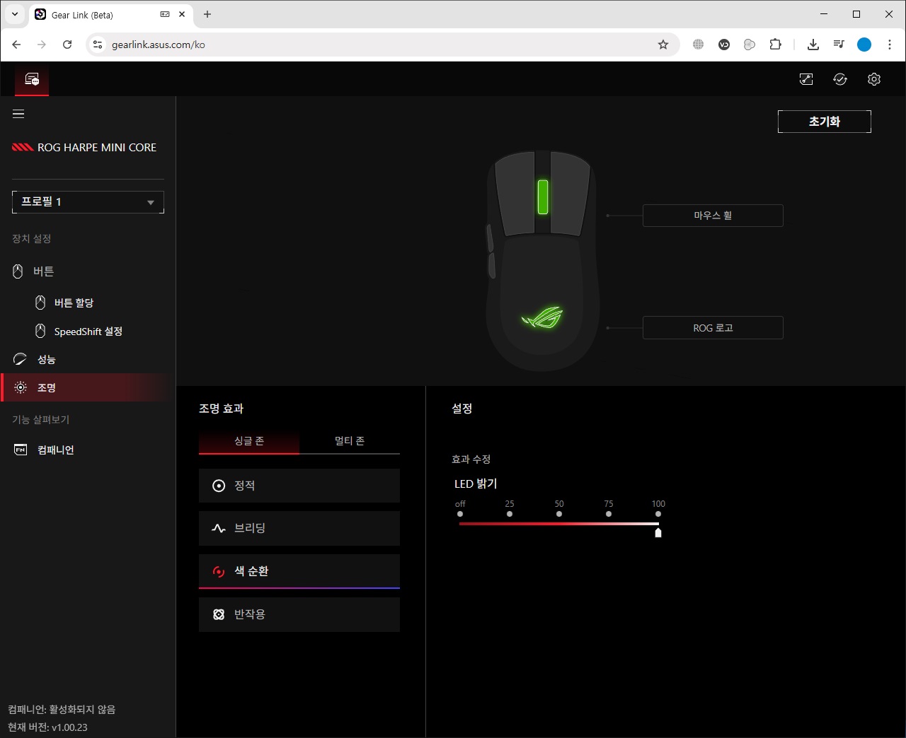 조명 효과는 싱글 존과 멀티 존으로 구분되는데 마우스 휠과 ROG 로고 모두 동일한 효과를 사용할 것인지 아니면 별도의 효과를 각각 적용시킬 것인지를 설정하는 것입니다.