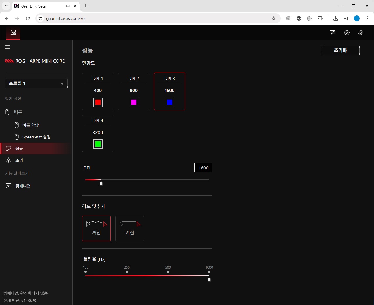 DPI는 4단계로 구분되고 있으며 최대 12,000DPI와 50단위로 설정할 수 있습니다. 각 DPI는 색상으로 구분되며 사용자가 임의로 변경할 수 있습니다. 각도 맞추기라는 기능을 추가 제공하고 있는데 이를 사용할 경우 마우스의 움직임을 소프트웨어가 보정하여 수평 및 수직 이동을 완벽하게 일직선으로 만들어주는 기능을 말합니다.