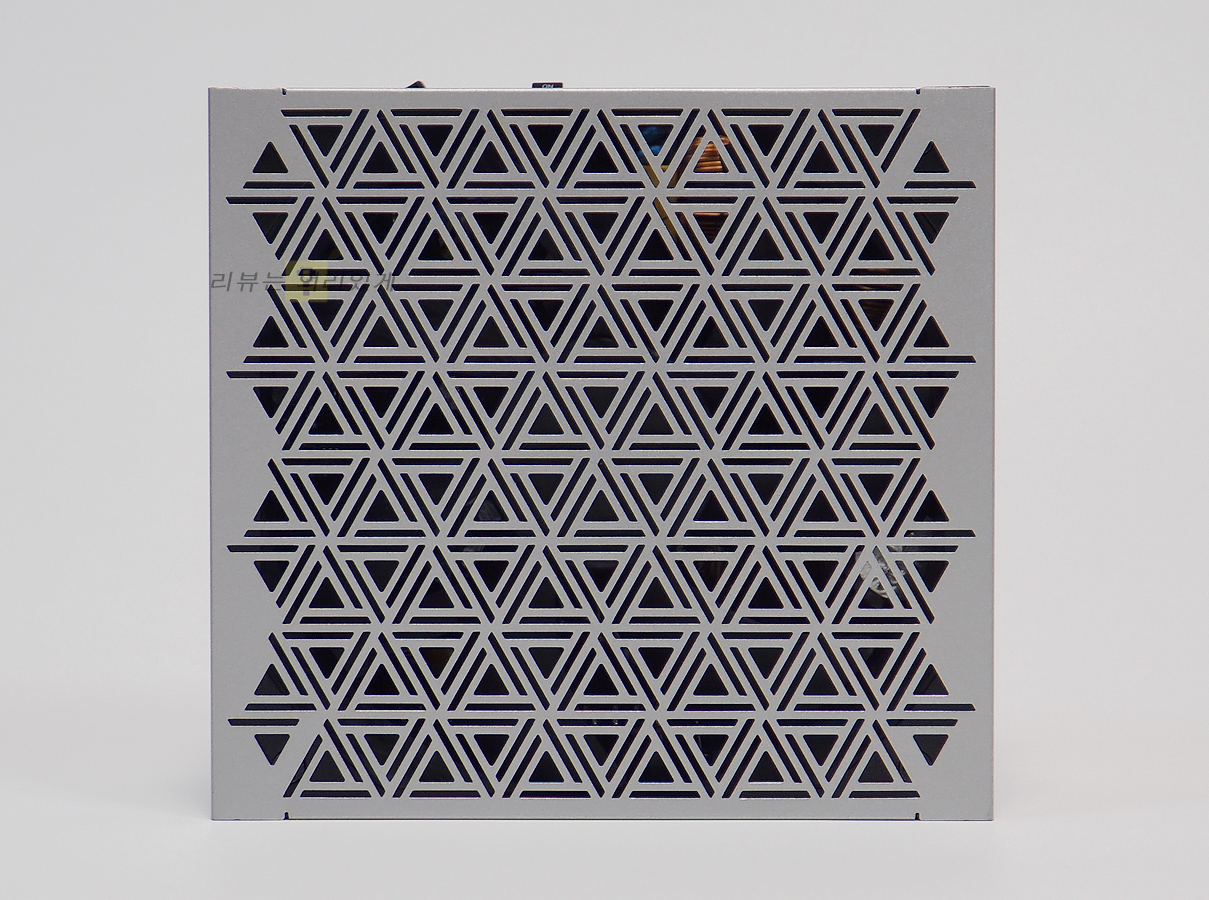 제품 스펙을 포함하여 효율 인증과 모델명 등 여러 내용이 포함된 스티커가 부착되어 있으며 팬 그릴은 삼각형 중심으로 한 기하학적 패턴이 사용되었으며 일체형 방식이 사용되었습니다.
