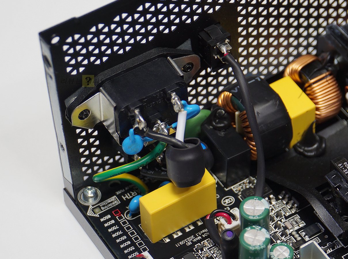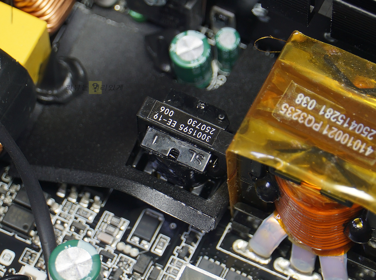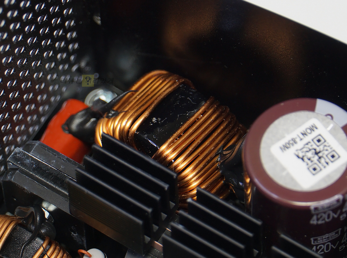 1차 커패시터는 NIPPON CHEMI-CON 470uF / 420V - 105℃와 NIPPON CHEMI-CON 390uF / 420V - 105℃가 각각 1개씩 사용되었으며 2차 커패시터는 2200uF / 16V, 10V - 105℃ 등이 사용되었습니다. 메인 트랜스와 스위칭 트랜스 구성을 확인할 수 있었으며 EMI 필터, 여러 폴리머 커패시터가 사용되었습니다.