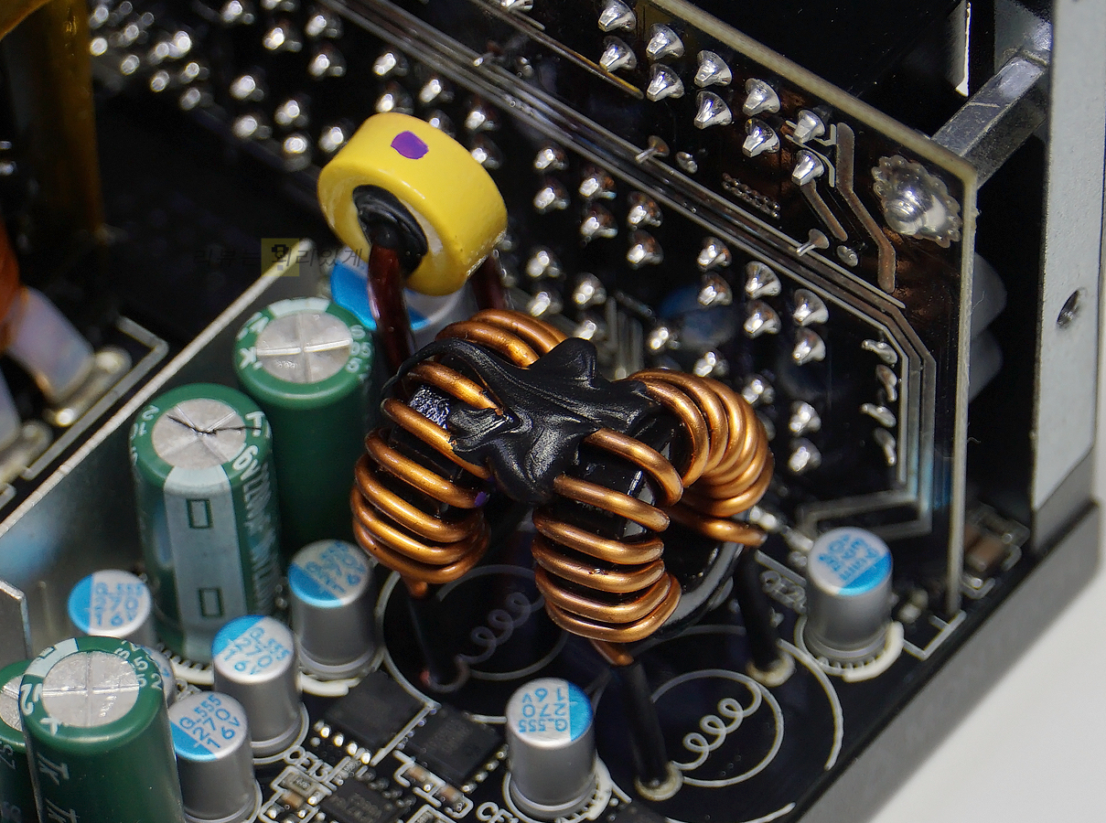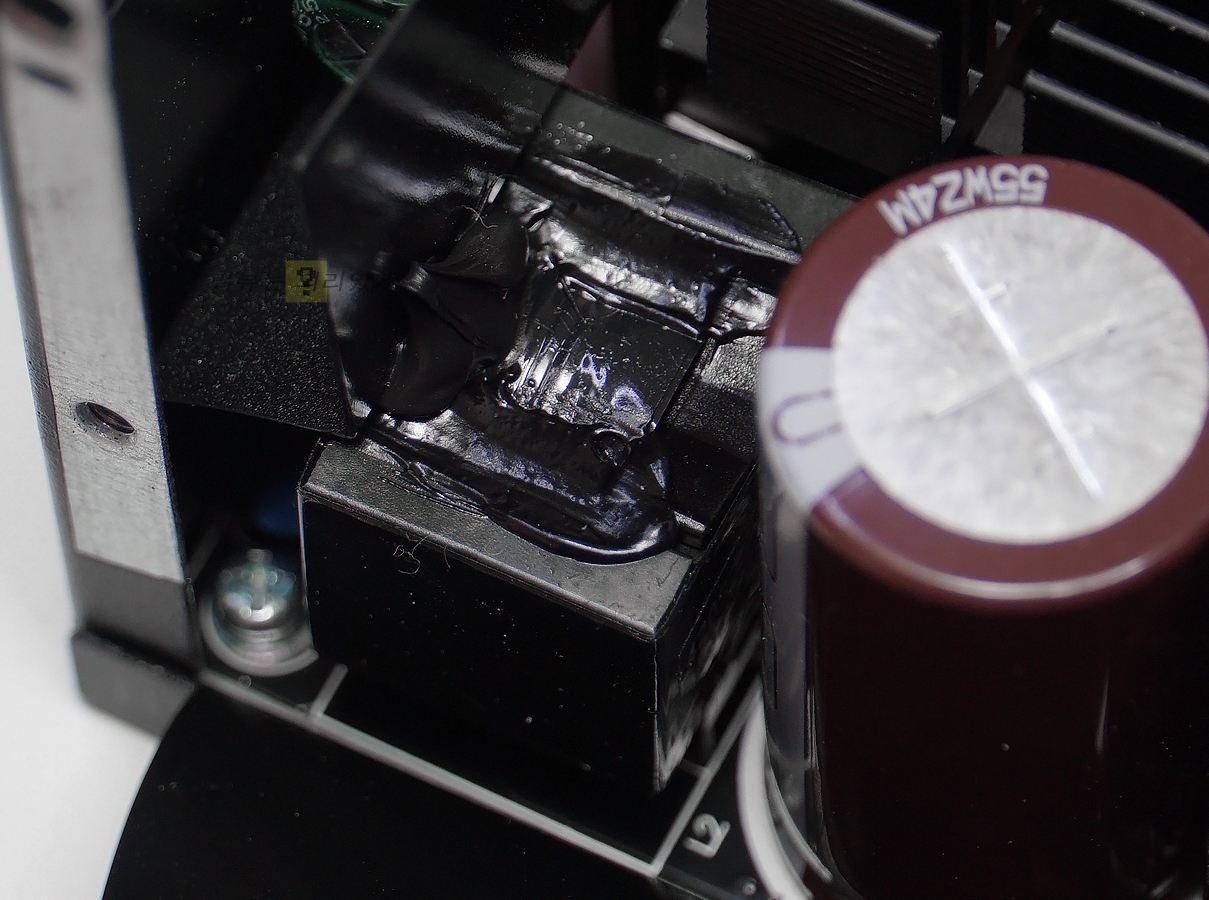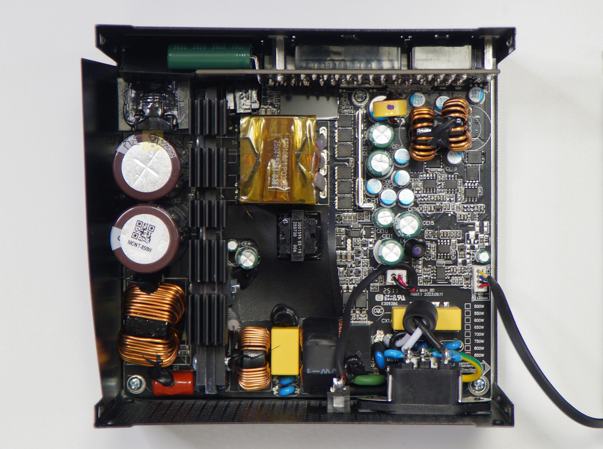 1차 커패시터는 NIPPON CHEMI-CON 470uF / 420V - 105℃와 NIPPON CHEMI-CON 390uF / 420V - 105℃가 각각 1개씩 사용되었으며 2차 커패시터는 2200uF / 16V, 10V - 105℃ 등이 사용되었습니다. 메인 트랜스와 스위칭 트랜스 구성을 확인할 수 있었으며 EMI 필터, 여러 폴리머 커패시터가 사용되었습니다.