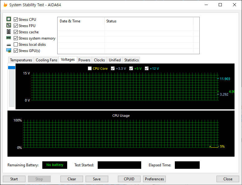 AIDA64 System Stability Test - 파워 서플라이 전압(+3V, +5V, +12V 측정)