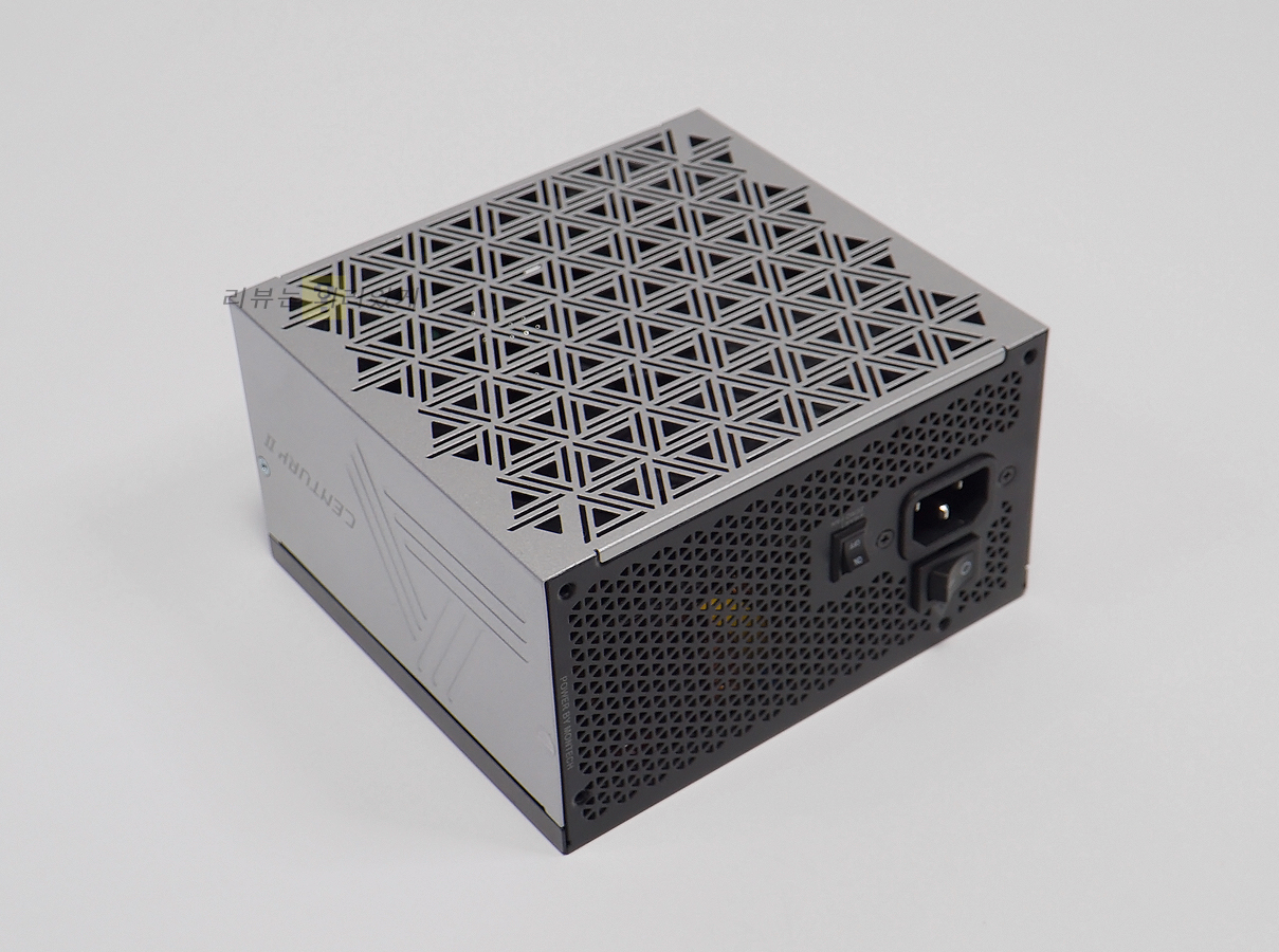 후면에는 작은 삼각형 모양 패턴의 에어홀이 있으며 전원 스위치와 스마트 제로 팬 스위치가 부착되어 있습니다. 스마트 제로 팬은 흔히 말하는 그래픽카드의 0 dB 제로팬 같은 기술로서 파워의 출력 부하가 일정 수준 보다 낮을 경우 쿨링팬의 작동을 멈추게 하는 것을 말합니다. 이를 통해 파워서플라이의 소음을 줄이고 팬 수명 연장을 기대할 수 있습니다. 이 기능을 원하지 않는 경우도 있으니 스위치를 추가하여 기능 사용 여부를 선택할 수 있게 하였습니다.