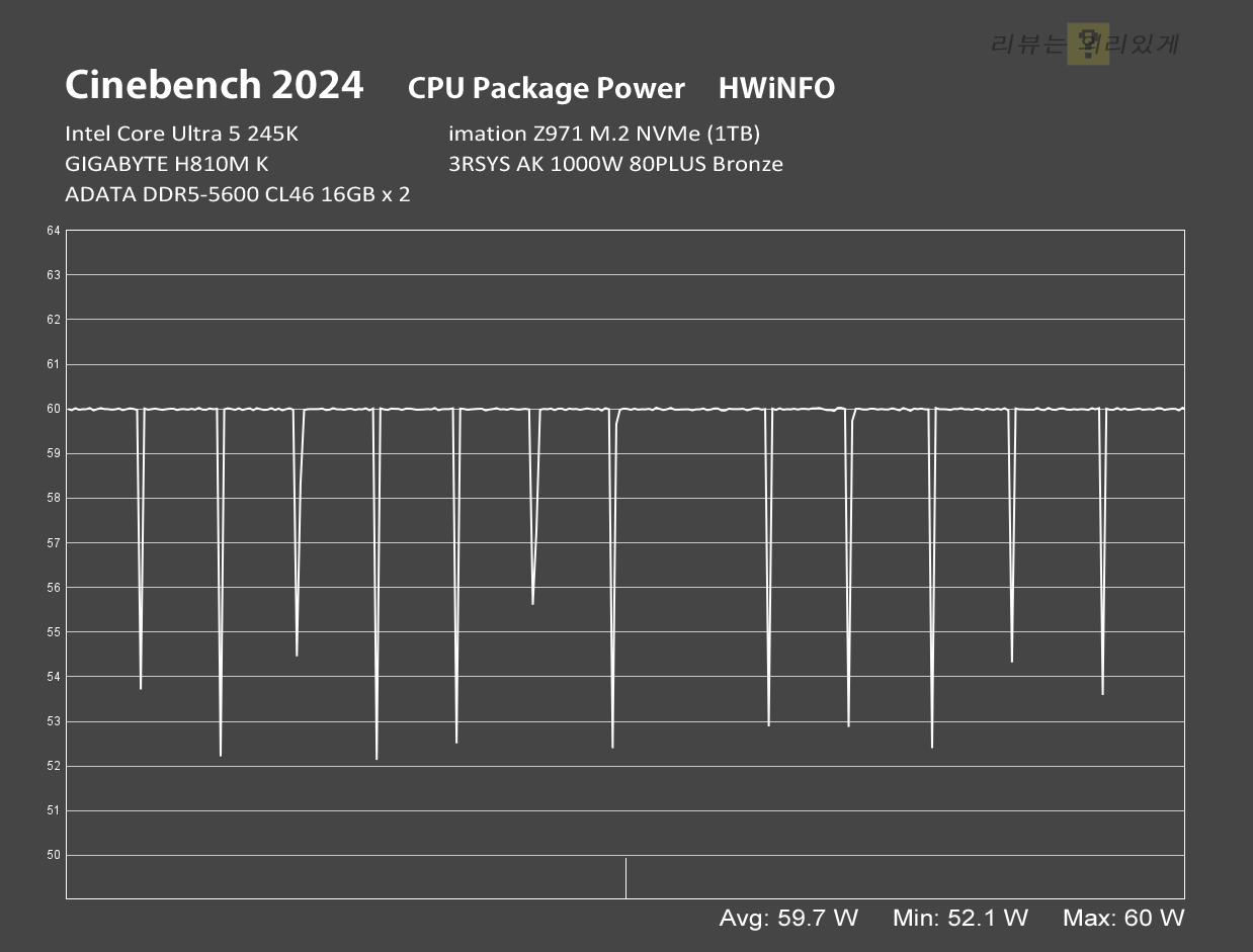 시네벤치 2024 벤치마크 중 일부 구간에서 클럭이 낮아지는 경우가 있었으나 이는 벤치마크 중 부하가 없던 구간이 존재하였기 때문으로 성능 하락이라 볼 수 없습니다. 다만 P-코어와 E-코어 모두 인텔 코어 울트라 5 245K CPU 스펙보다 낮게 작동하였는데 이는 메인보드에서 60W 수준으로 전력을 제한하고 있었기 때문으로 보입니다. 이로 인해 오버클럭이 가능한 K CPU가 제 성능을 발휘하지 못한 것이 되었습니다.