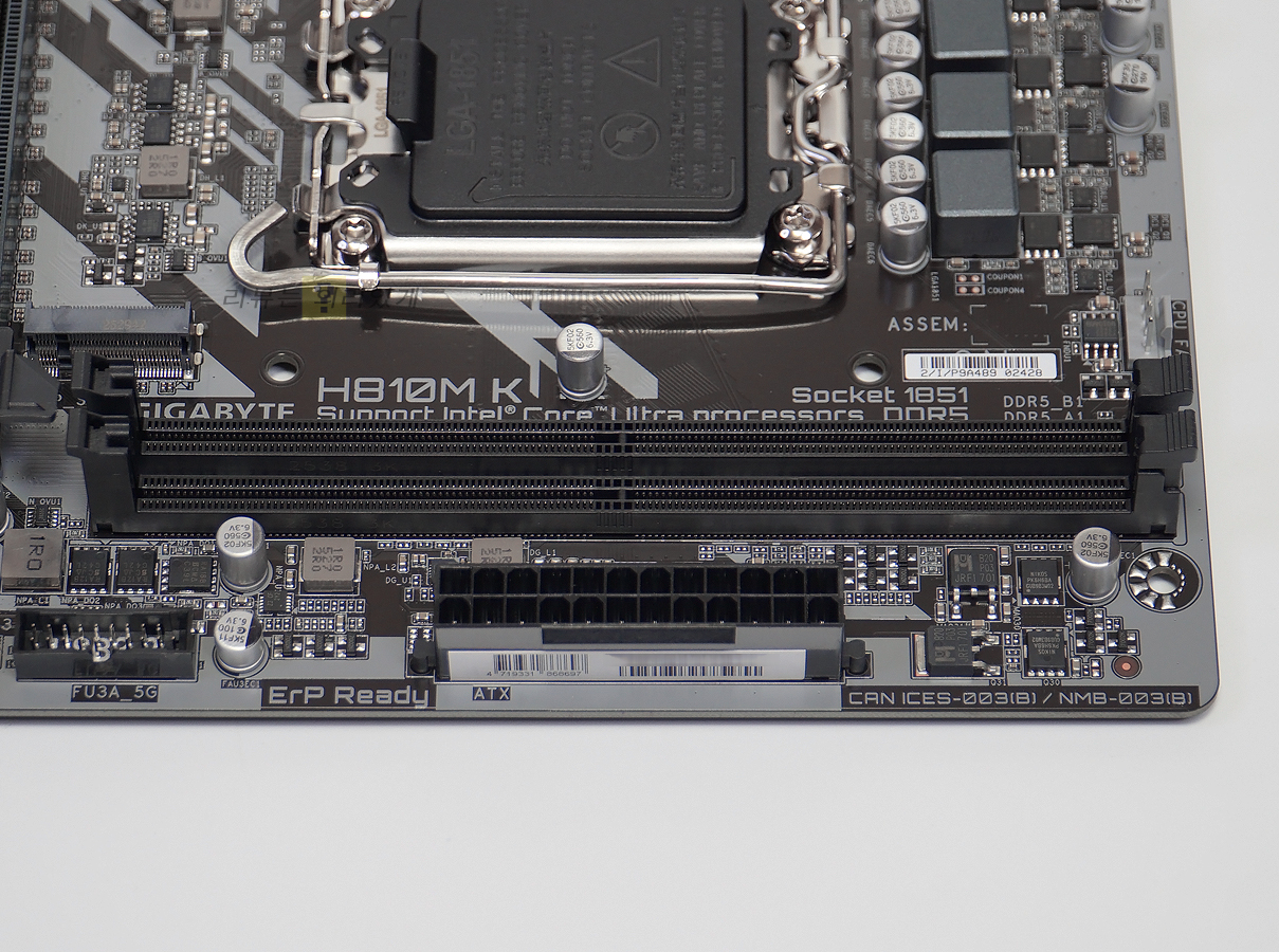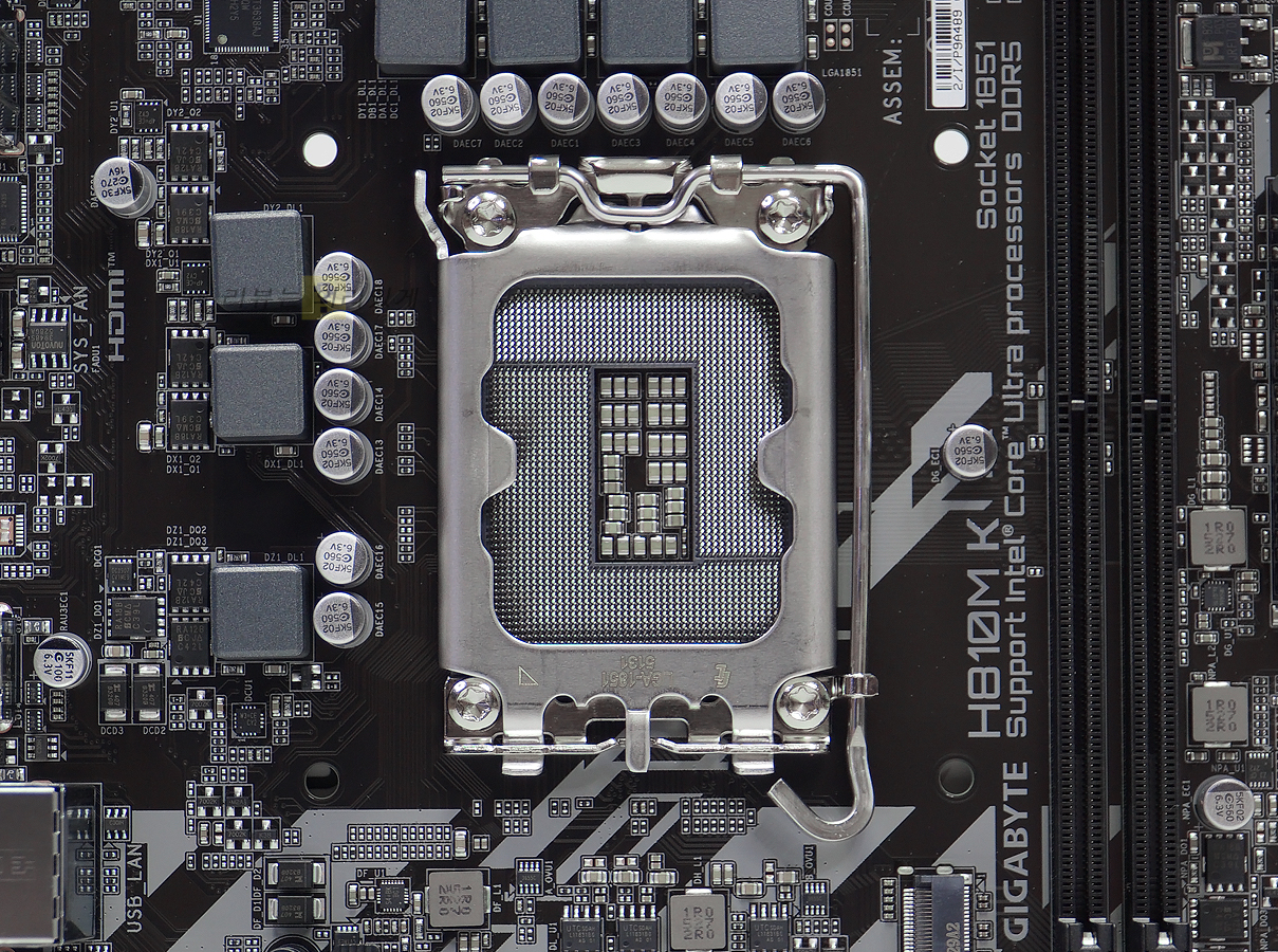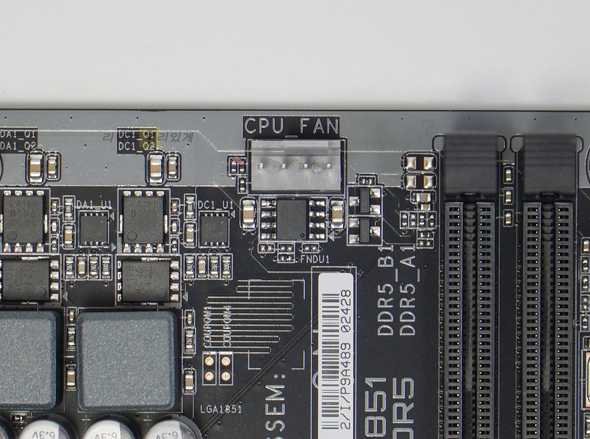 CPU 소켓은 인텔 LGA1851 방식을 사용하고 있으며 인텔 코어 울트라 프로세서 (시리즈 2)를 지원합니다. 소켓 보호를 위하 커버가 제공되고 있으며 사용하지 않을 때 외부로부터 내부 핀을 보호할 수 있습니다. CPU 장착 시 커버를 분리한 후 사용하게 되는데, 인텔은 이번 LGA1851 소켓으로 전환하면서 RL-ILM 로딩 장착 메커니즘을 채택하였기 때문에 이전 방식과 다르게 열리게 됩니다.