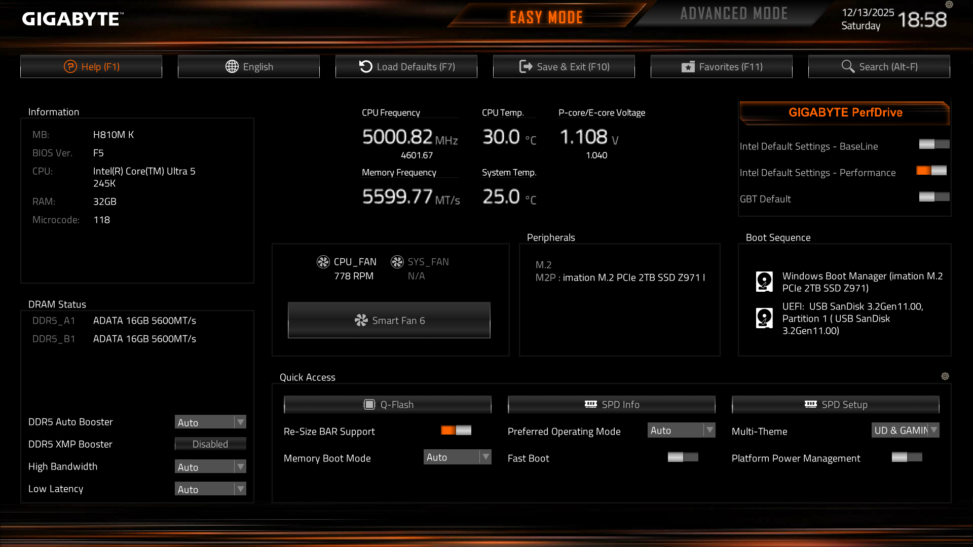 Re-Size BAR Support를 통해 PCIe 인터페이스 효율을 높여 CPU가 그래픽카드의 전체 VRAM에 더 효율적으로 접근할 수 있게 합니다. CPU 성능을 향상시키기 위한 GIGABYTE 자체 성능 프로파일인 GIGABYTE PerfDrive를 지원하고 있으며, Intel Default Settings - Baseline과 Intel Default Settings - Performance 둘 중 하나를 선택하여 기본적인 상태로 사용하거나 성능을 끌어올리는 상태로 사용할 수도 있습니다.