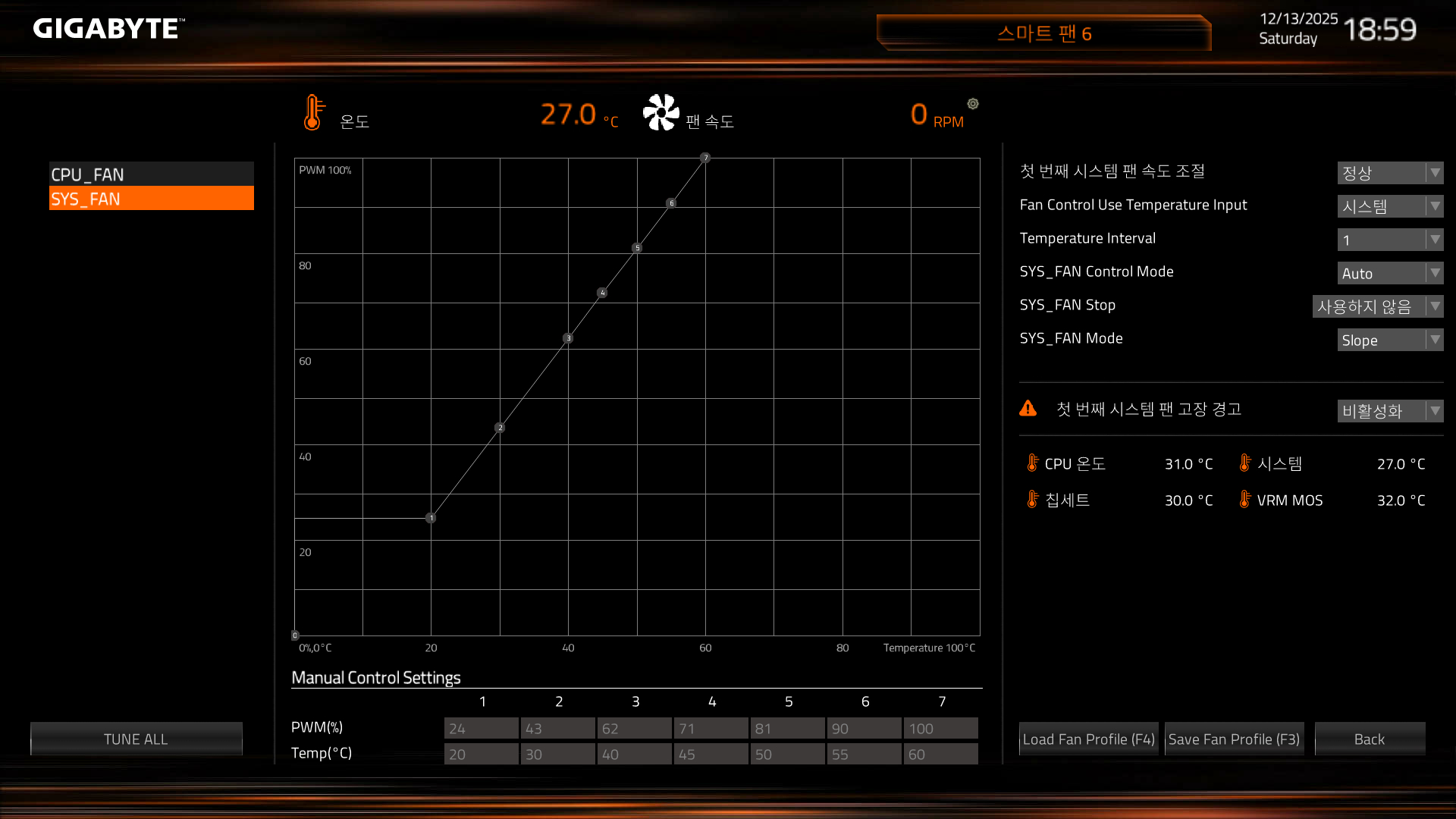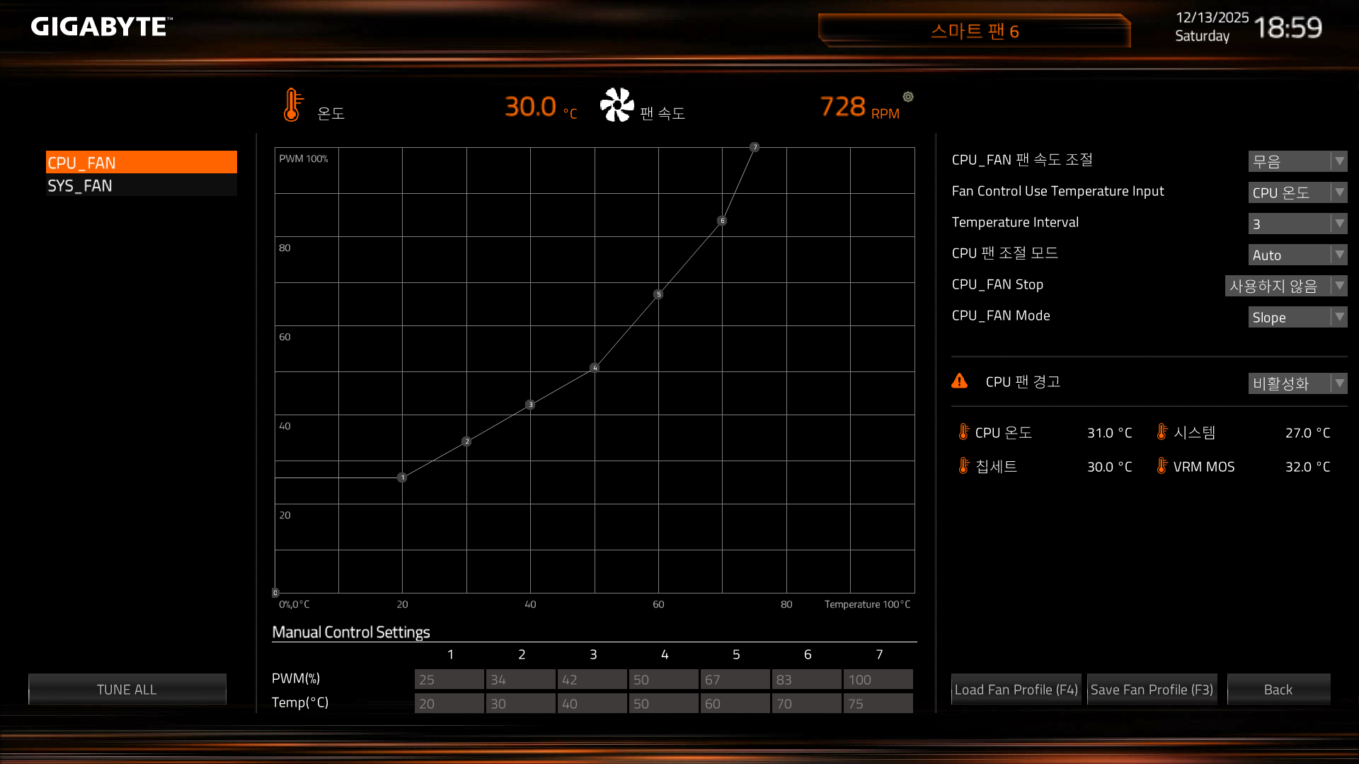 스마트 팬을 사용해 CPU 및 시스템 팬 속도 설정을 지원하고 있습니다. 그래프 인터페이스를 통해 팬 속도와 온도 관계를 설명하고 있으며 마우스로 직접 움직여 제어 곡선을 만들 수 있습니다.