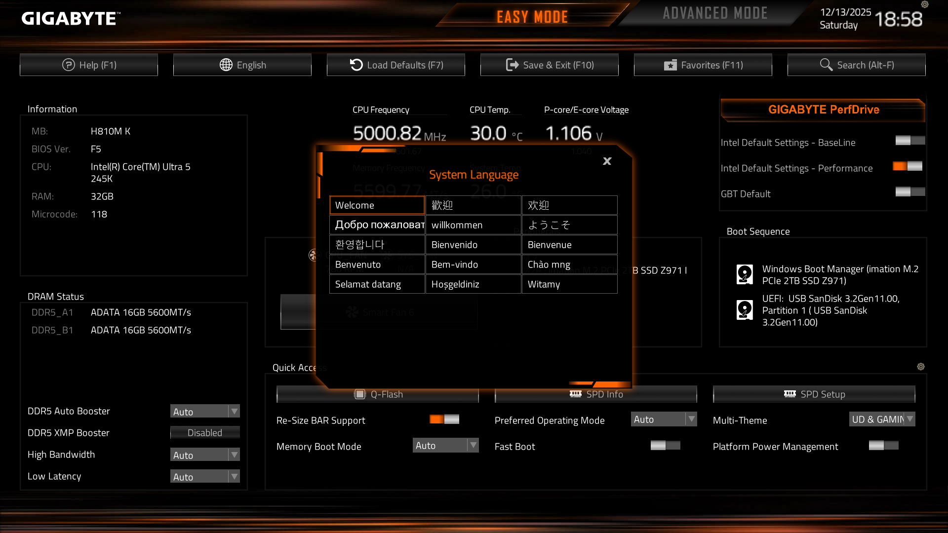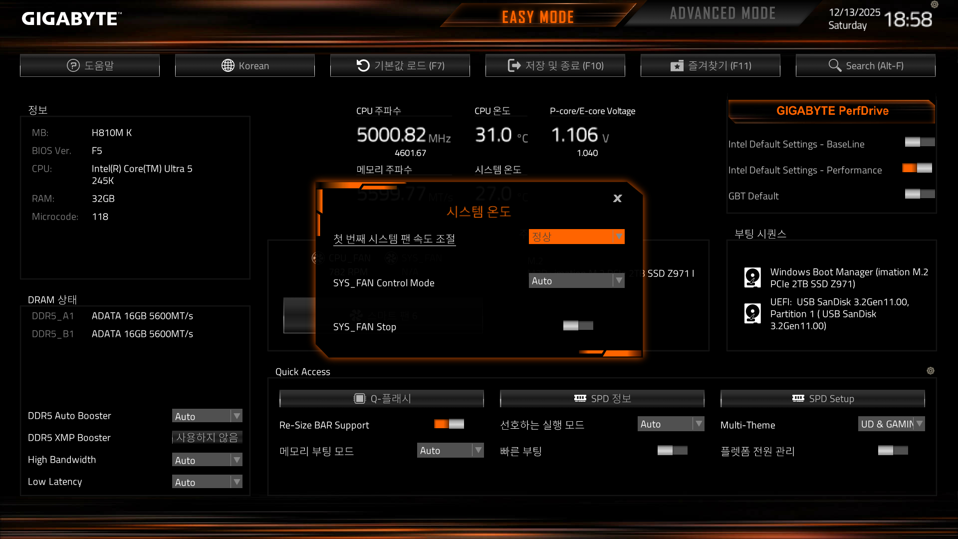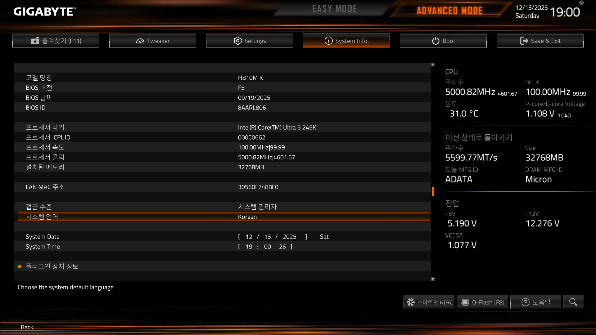 UEFI는 한국어를 포함하여 여러 언어를 지원하고 있으며 이지 모드와 어드밴스 모드로 구분됩니다. 메인화면에서는 메인보드 모델명과 바이오스 버전, 장착된 CPU 모델명, RAM 용량, 마이크로코드가 언급되어 있습니다. 장착된 RAM은 모델명과 용량, 클럭을 간략하게 설명하고 있으며 XMP를 포함한 기술 지원 유무 등을 확인할 수 있습니다.