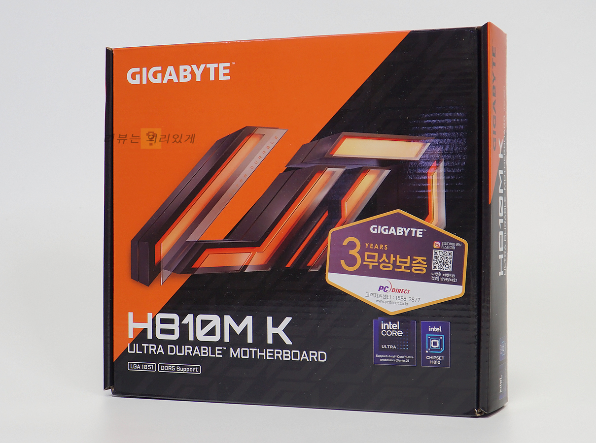 제품 특징과 스펙에 대한 설명을 확인할 수 있습니다. 대체로 메인보드 패키지에는 개봉 방지를 위한 봉인 스티커는 부착되어 있지 않습니다. 해당 모델은 피씨디렉트 유통 제품으로 유통사로부터 3년 무상 보증을 제공받을 수 있습니다.